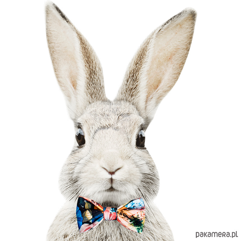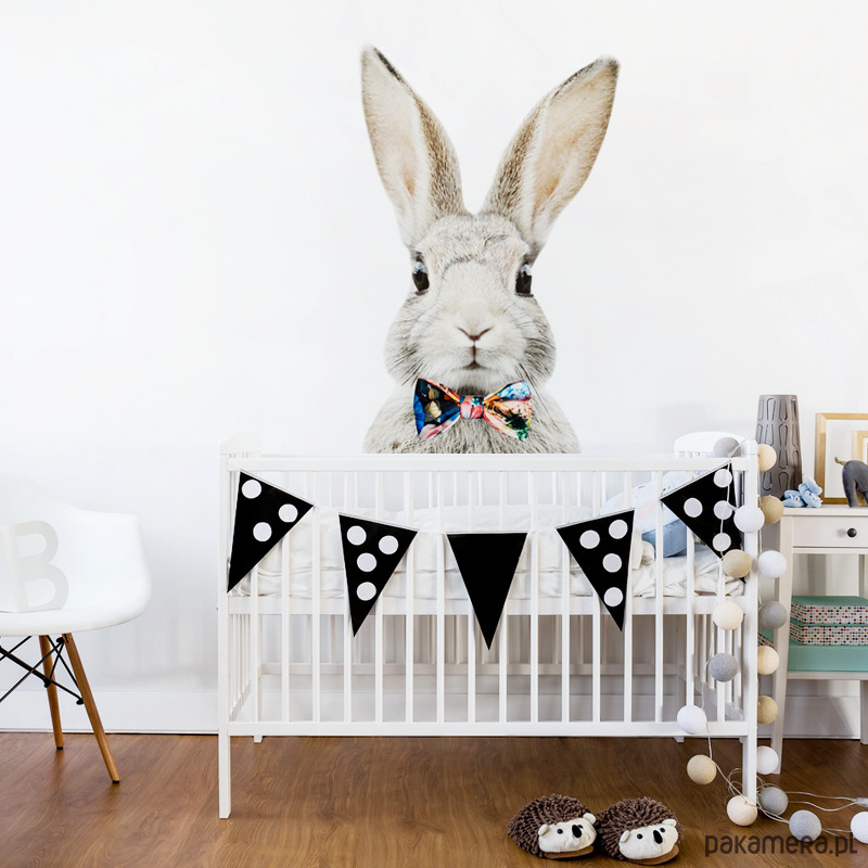 Naklejka na ścianę wycinana z folii drukowanej. Naklejka z motywem królika z muchą, w trzech wersjach kolorystycznych.