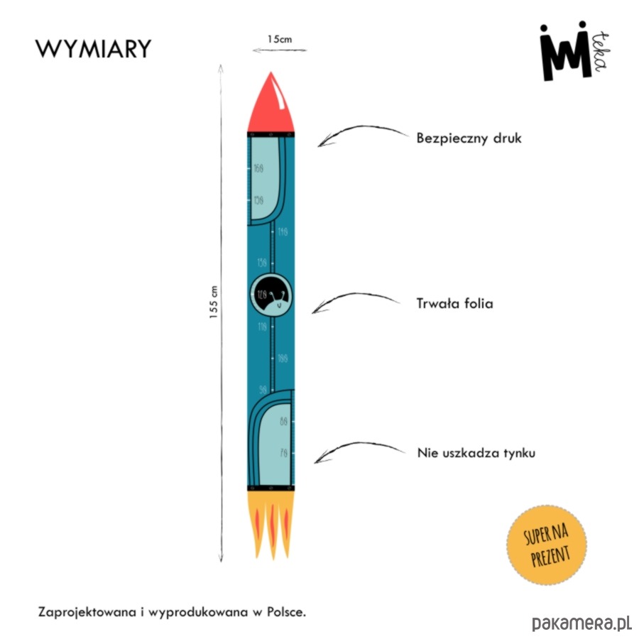 Miarka rakieta to wystrzałowy pomysł na zmierzenie się! Startuje wraz z kolorową podziałką, od 60 do 169 cm! Każdy paseczek to jeden centymetr w górę. Możecie po niej pisać i zaznaczać jak wysoko mierzycie. To dobra okazja do wspólnej zabawy. Mierzenie może sprawić wiele radości, a naklejka ozdobi pokój każdego wielbiciela kosmicznych podróży.