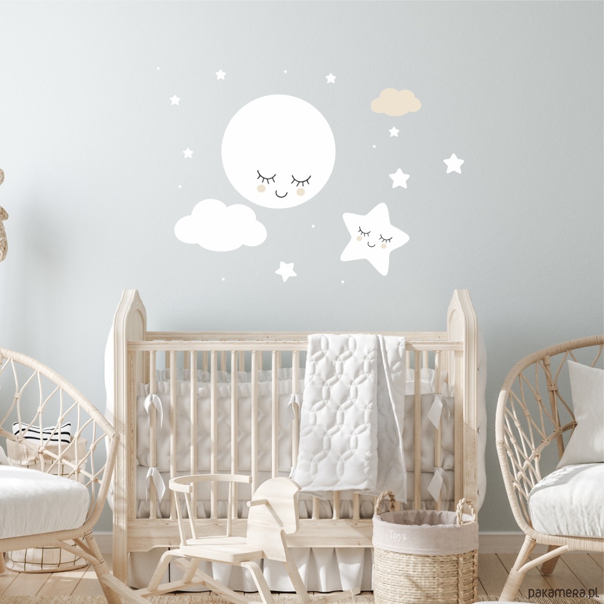 Stwórz magiczny, przytulny klimat w pokoju dziecka dzięki naszym delikatnym naklejkom ściennym! Ten słodki zestaw przedstawia uśmiechnięty księżyc, śpiącą gwiazdkę oraz chmurki otoczone mniejszymi gwiazdeczkami. Pastelowe kolory i miękkie kształty idealnie pasują do pokoju niemowlaka, przedszkolaka czy kącika wypoczynkowego.