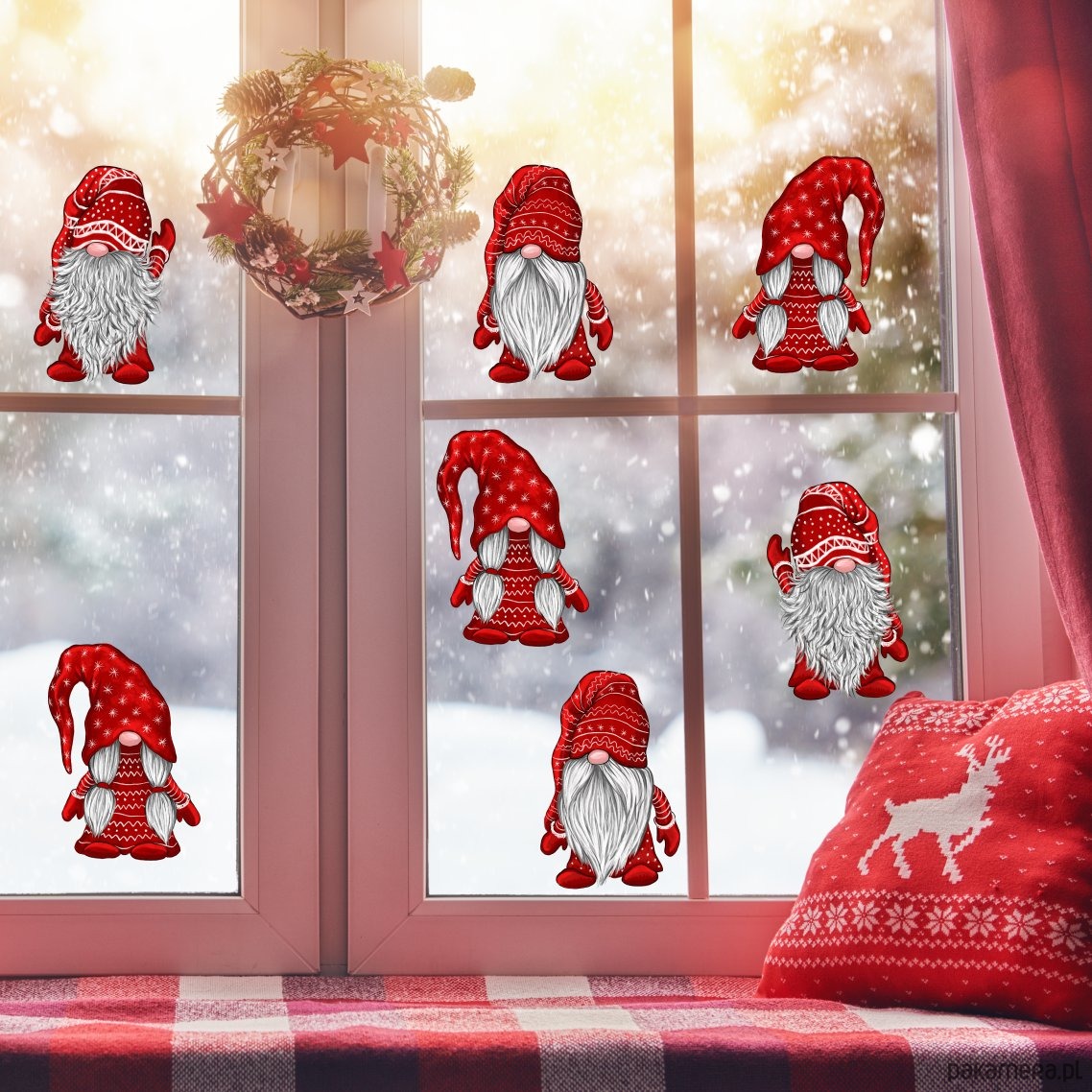 Przedstawiamy Państwu - naklejki na okno, drzwi... Krasnale Świąteczne. Każdy z dziewięciu skrzatów przyklejany jest oddzielnie. Naklejki można przykleić wewnątrz i na zewnątrz. Zaletą tych naklejek jest to, że są łatwo usuwalne.