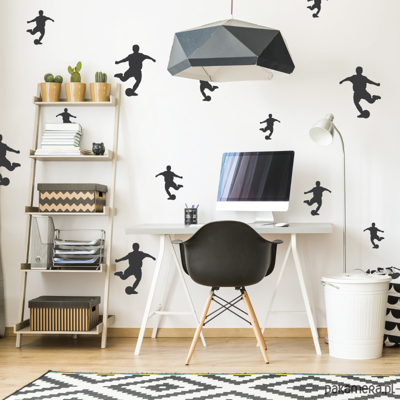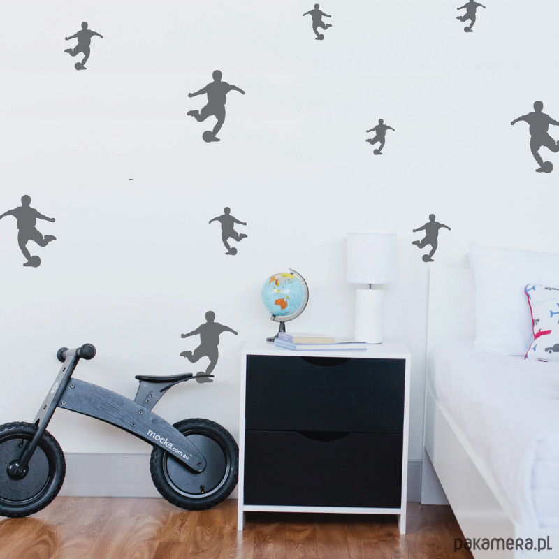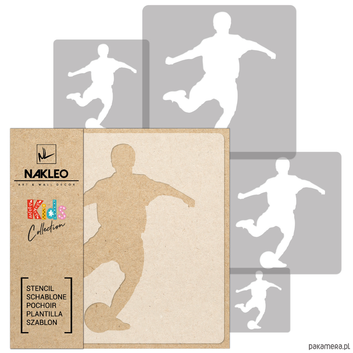 Nakleo Kids Collection to zestawy pięciu szablonów wykonanych z wytrzymałego tworzywa sztucznego składające się z arkuszy o wymiarach od 34x34cm do 9x9cm. Szablony można używać dowolną ilość razy dzięki czemu z łatwością pokryjesz nawet największe ściany dowolną kompozycją wzorów i kolorów. Daj się ponieść fantazji, spraw frajdę sobie i swojemu dziecku. Sylwetki kopiących piłkę piłkarzy na ścianie będą idealnym dodatkiem do wystroju wnętrza każdego młodszego i starszego fana futbolu.