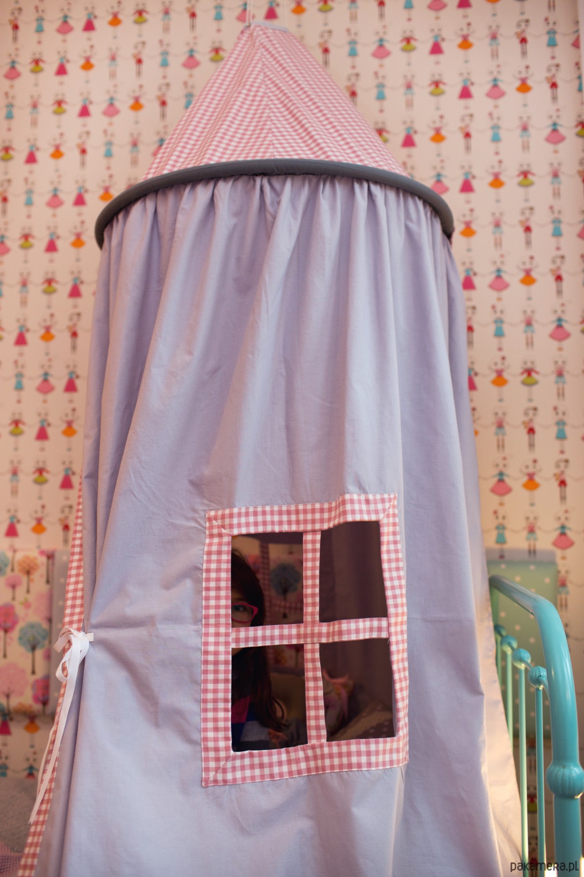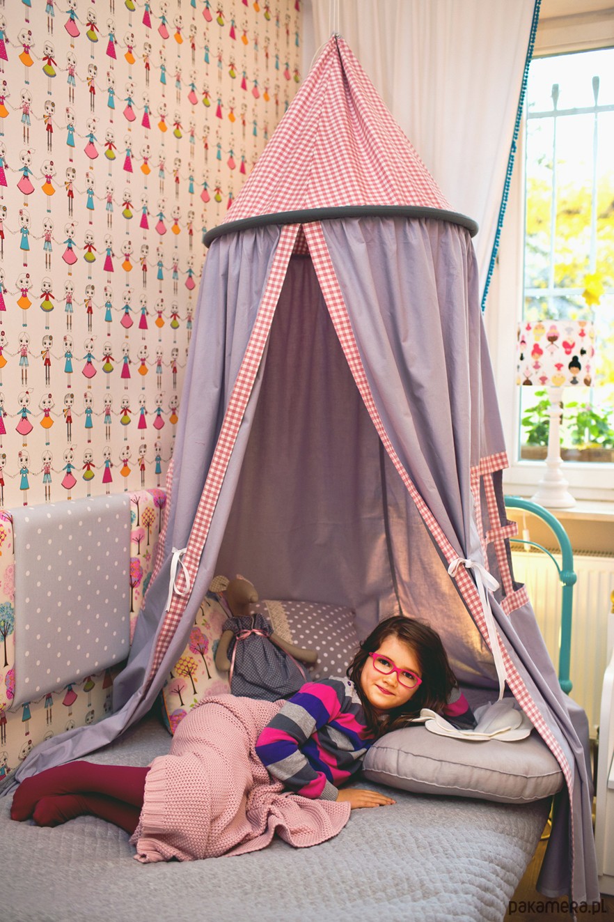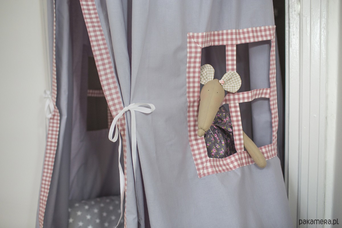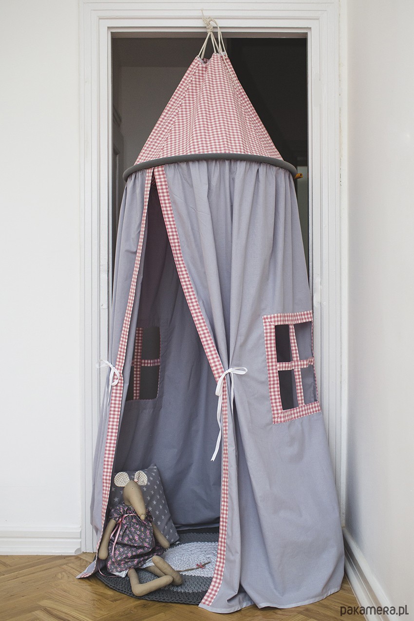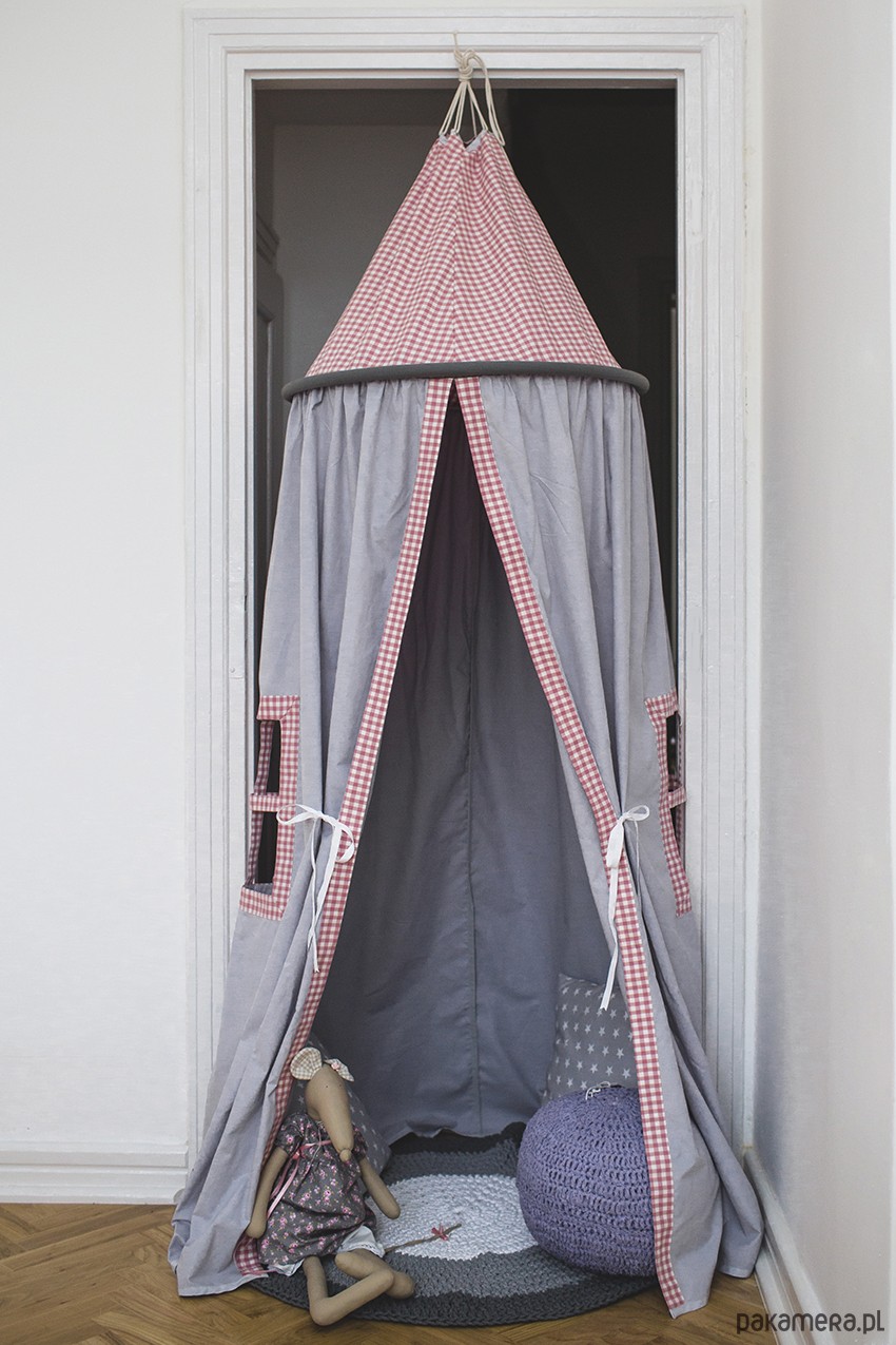 Tkanina: Połączenie szarej bawełny z różową krateczką. Namiot posiada dwa okienka. TeePee wykonane jest z naturalnych materiałów, przyjaznych dzieciom. Doskonale komponuje się w pokoju dziecięcym. W przypadku zabrudzenia pokrowca TeePee, można go zdjąć ze stelaża i wyprać, dzięki czemu będzie służył przez długi czas. Wymiary: Długość namiotu : 215 cm Średnica koła : 70 cm Wysokość od sufitu można regulować sznurkiem.