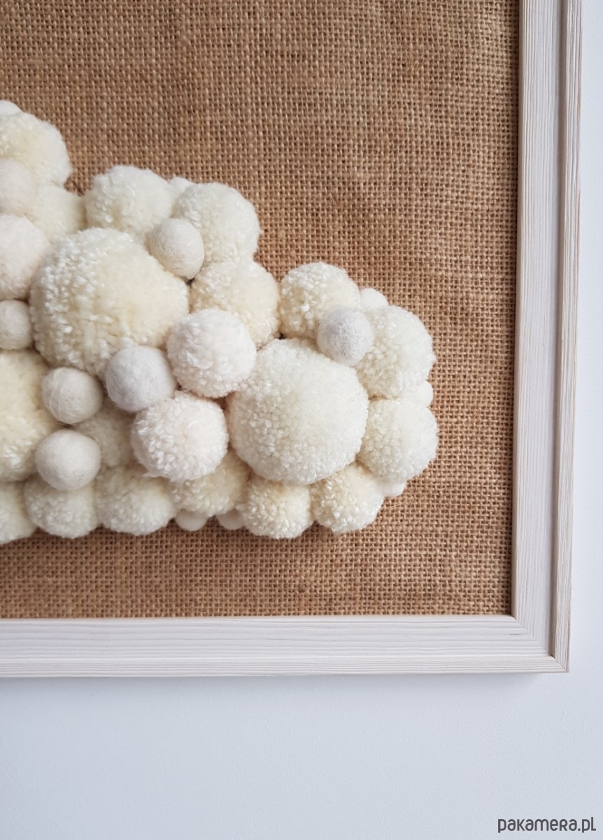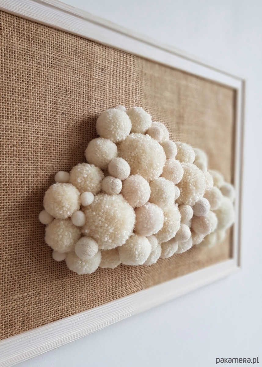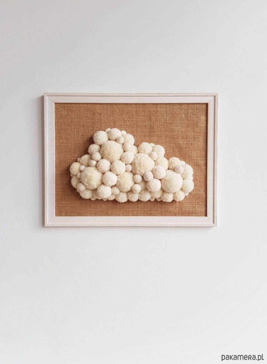 Oryginalna dekoracja do pokoju dziecka. Chmurka wykonana jest z wełny i czasanki , tło to naturalna juta.