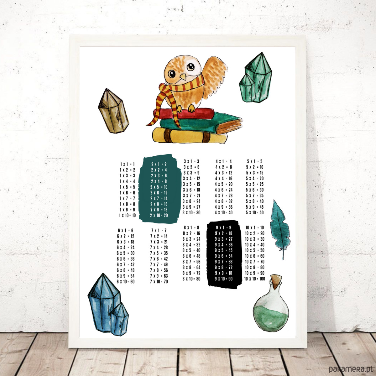 Plakat z motywem sowy i ksiąg magicznych wymalowanych ręcznie akwarelą dla wielbicieli Harrego Pottera. Plakat wzbogacony o tabliczkę mnożenia.