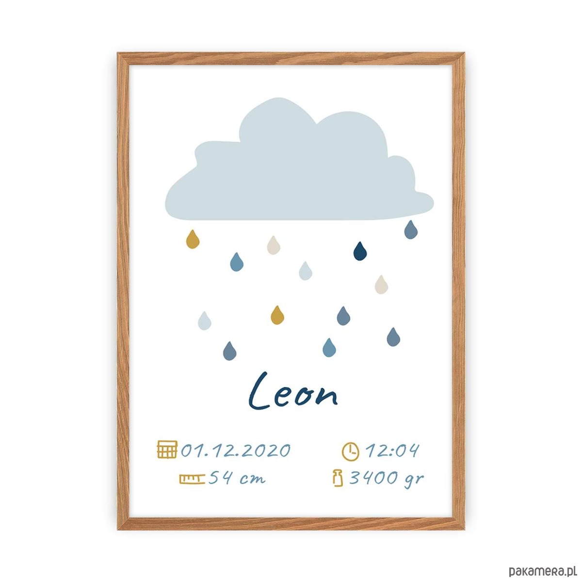 Obrazek - metryczka może być również pięknym prezentem od serca dla świeżo upieczonych rodziców. Nasz projektant - artysta, inspirując się uczuciem jakie towarzyszy rodzicom witającym na świecie swoją pociechę, stworzył uroczy zestaw obrazków "Rain of Happiness".