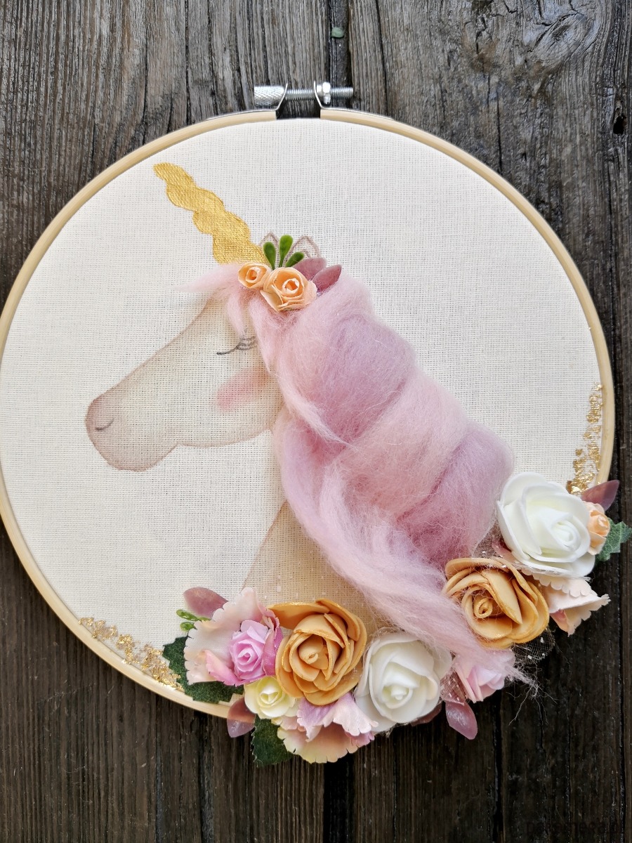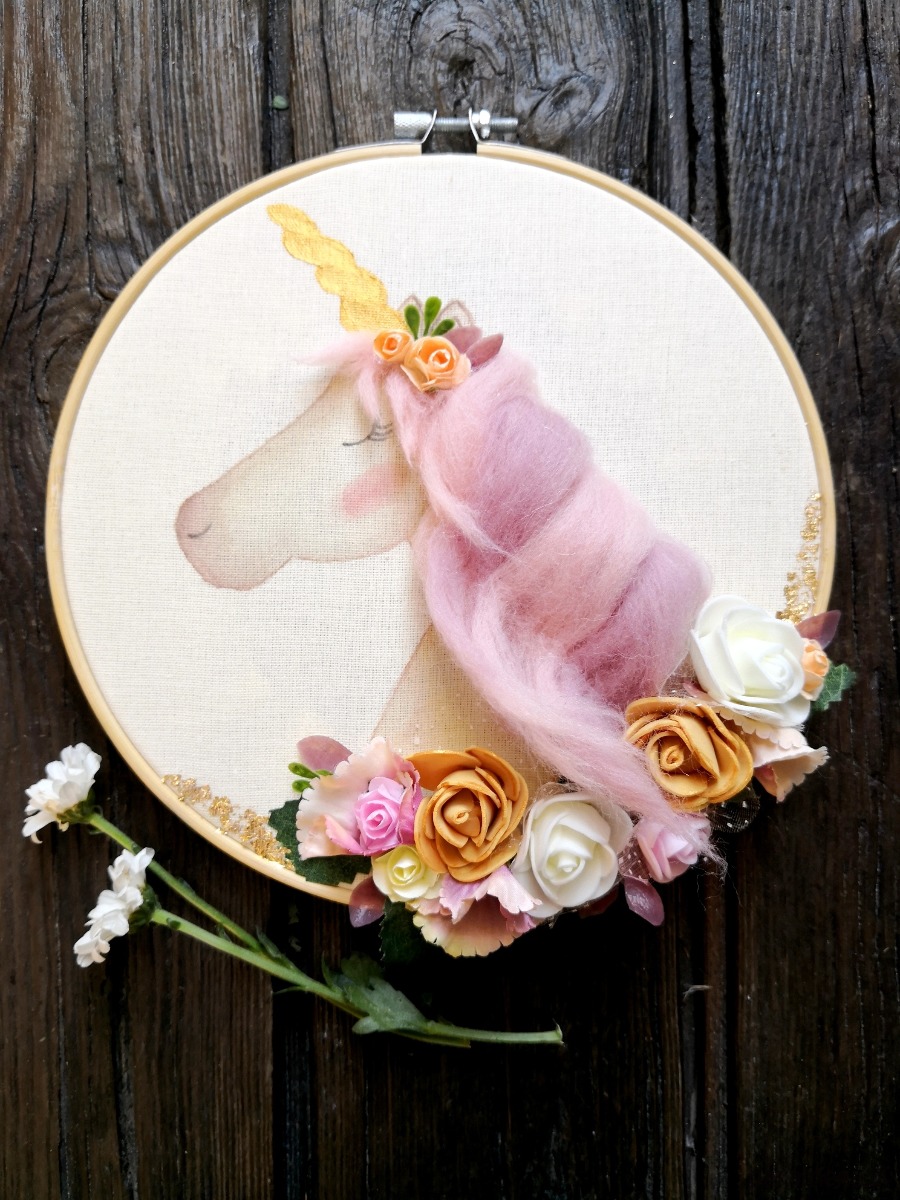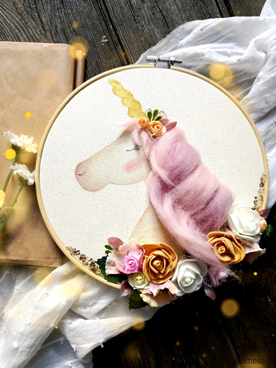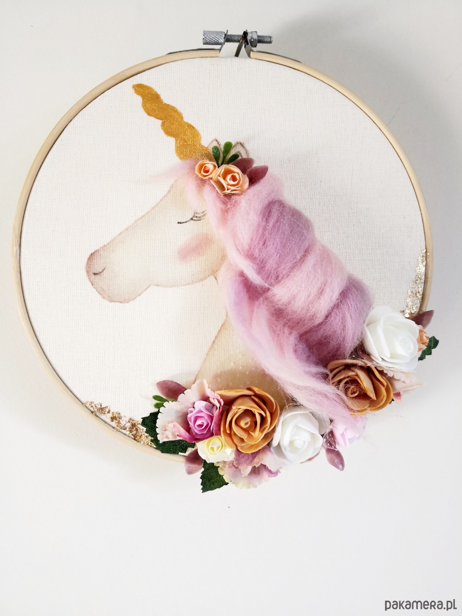 Efekt 3D tworzy grzywa jednorożca oraz kwiatowe zdobienie, do którego zostały użyte kwiaty papierowe, materiałowe oraz piankowe.