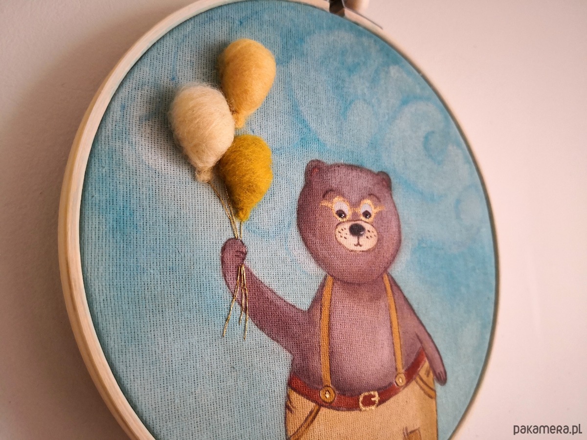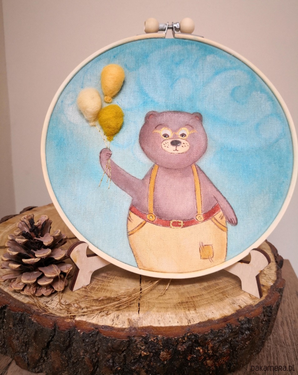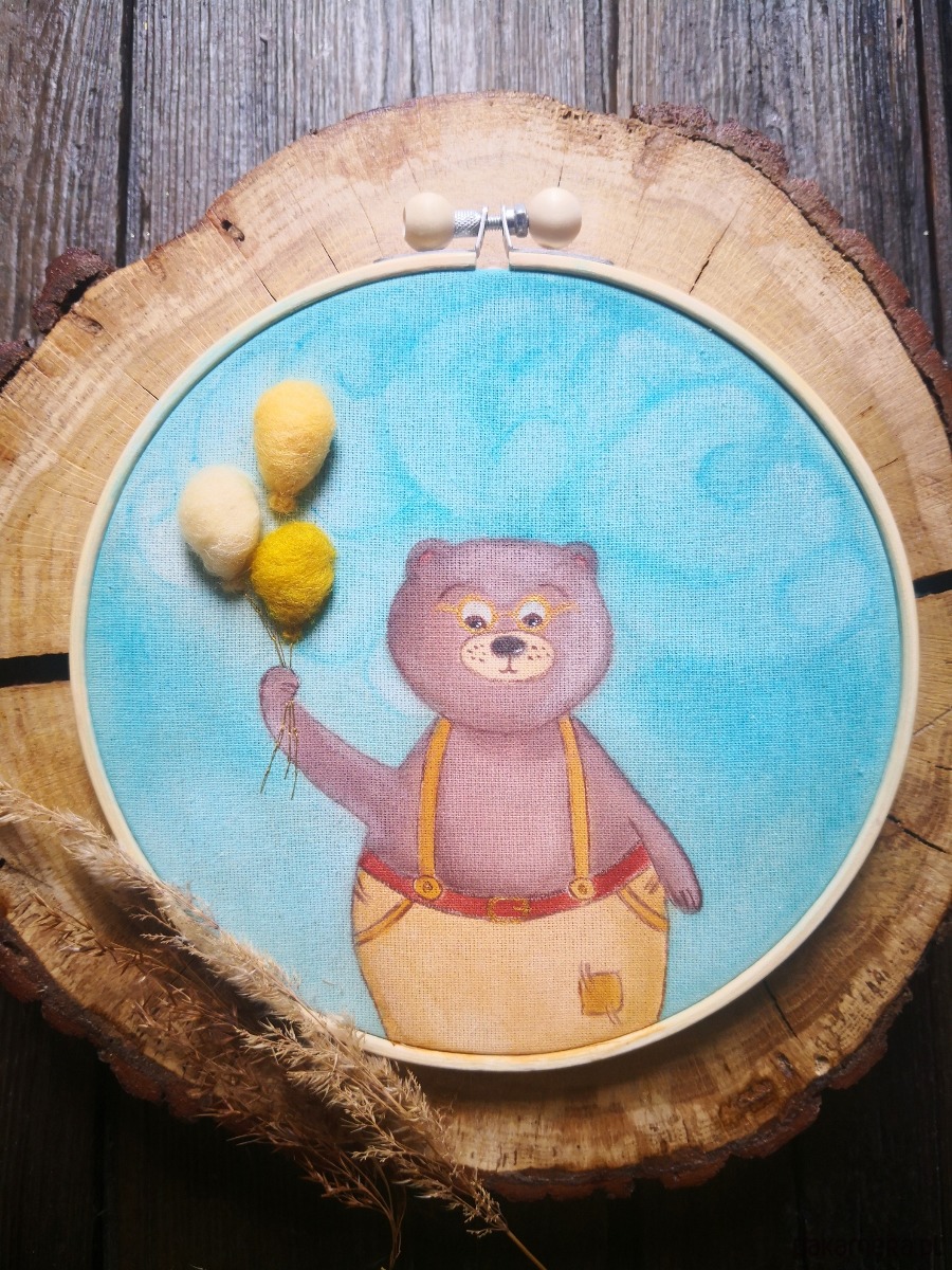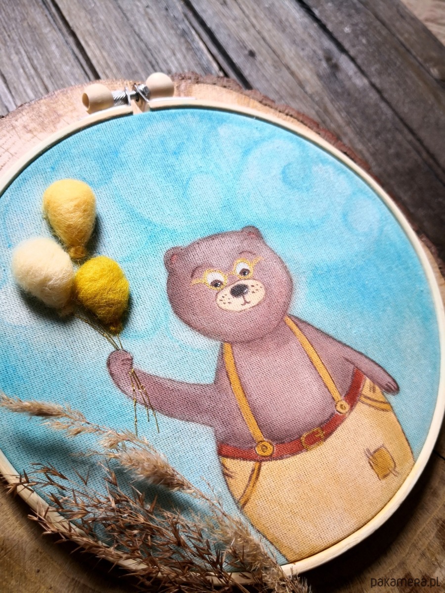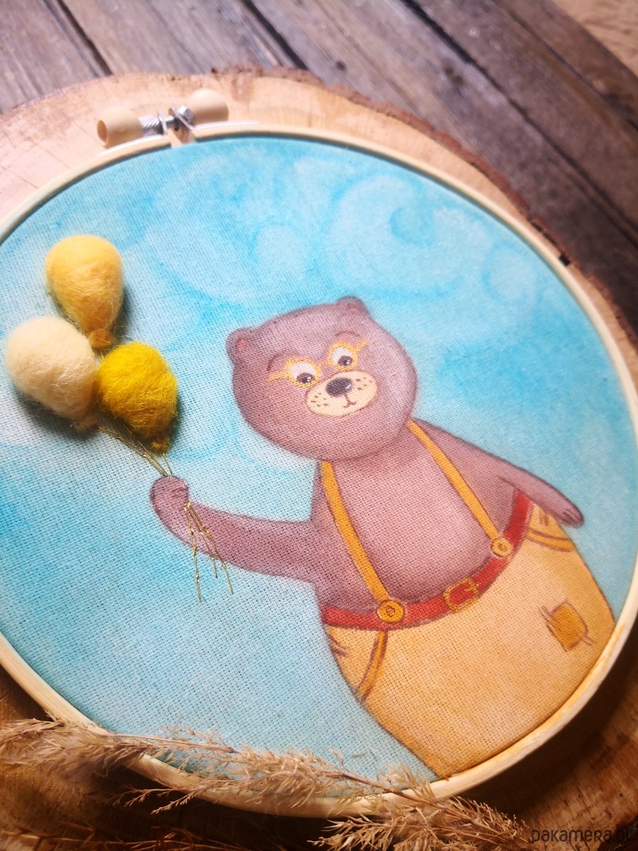 Obrazek został namalowany farbami akwarelowymi, wykorzystane zostały także elementy haftu ręcznego.