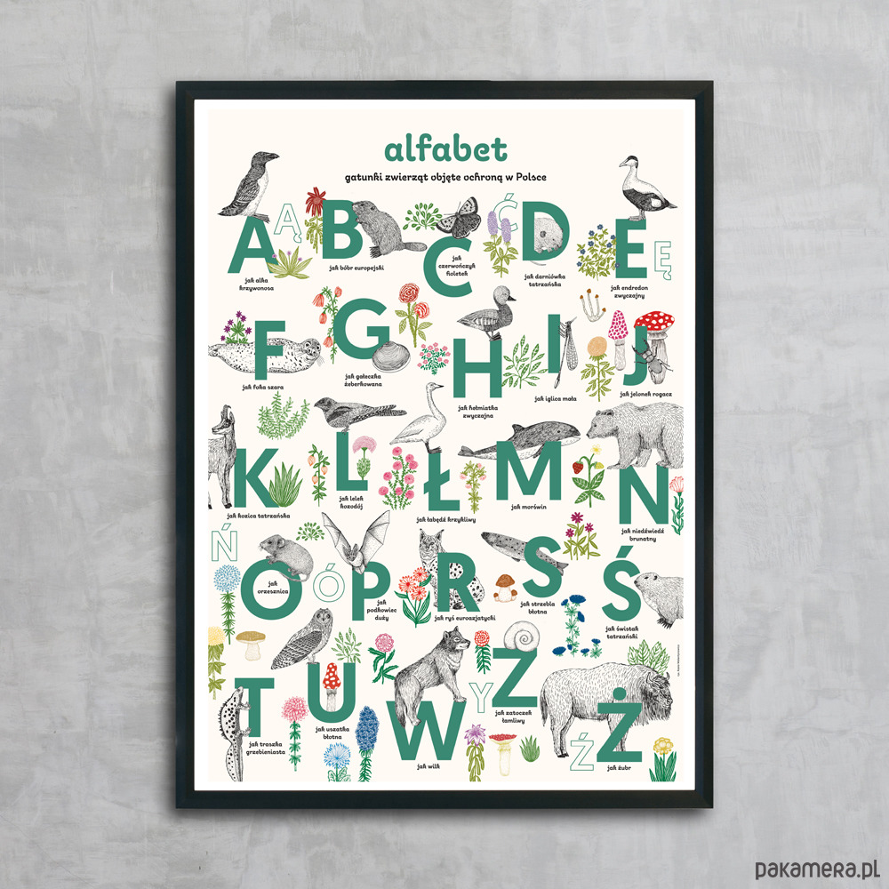 Plakat edukacyjny, idealny do pokoju dziecięcego. Pomaga poznawać i zapamiętywać litery, a jednocześnie przybliża gatunki zwierząt chronione w Polsce.