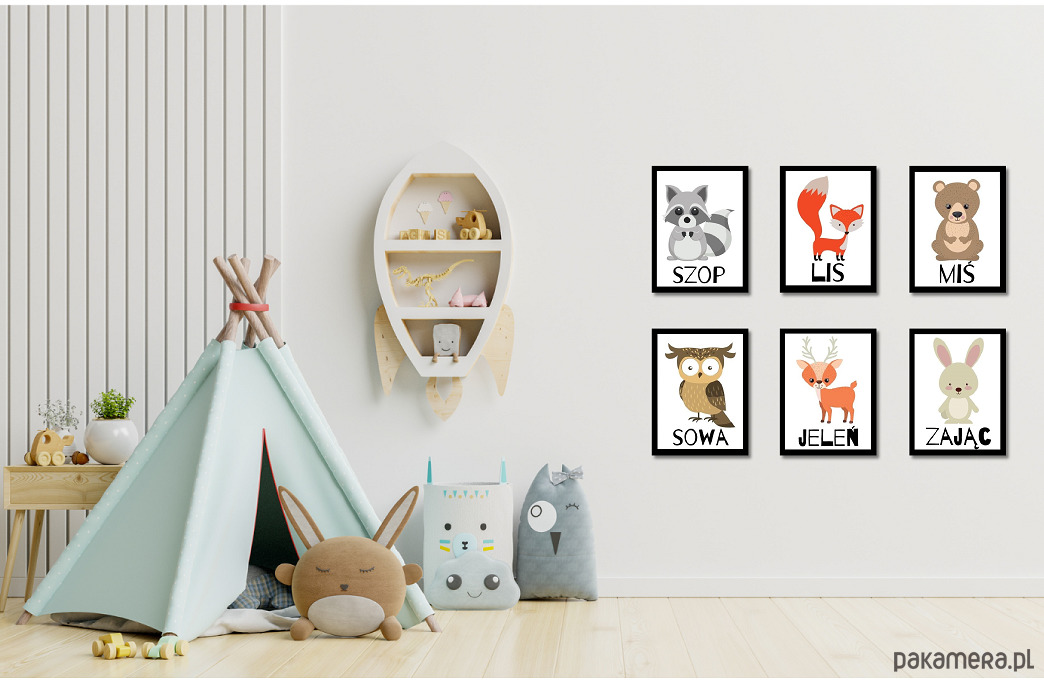 Zestaw 6 plakatów do pokoju dziecka w ramkach.