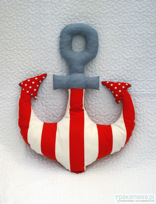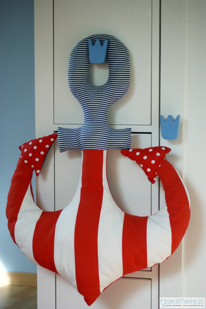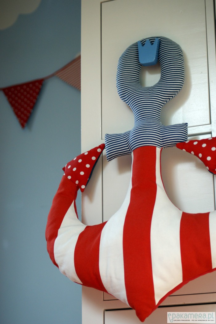 Poduszka KOTWICA. Uszyta z tkanin bawełnianych idealnie wpasuje się w dziecięcy pokój. Spełnia funkcję nie tylko podusi, ozdoby, ale może być wspaniałym atrybutem dziecięcych zabaw. Kotwica o wysokości 66 cm, szer.ok. 50 cm Wypełnienie poliestrowe.