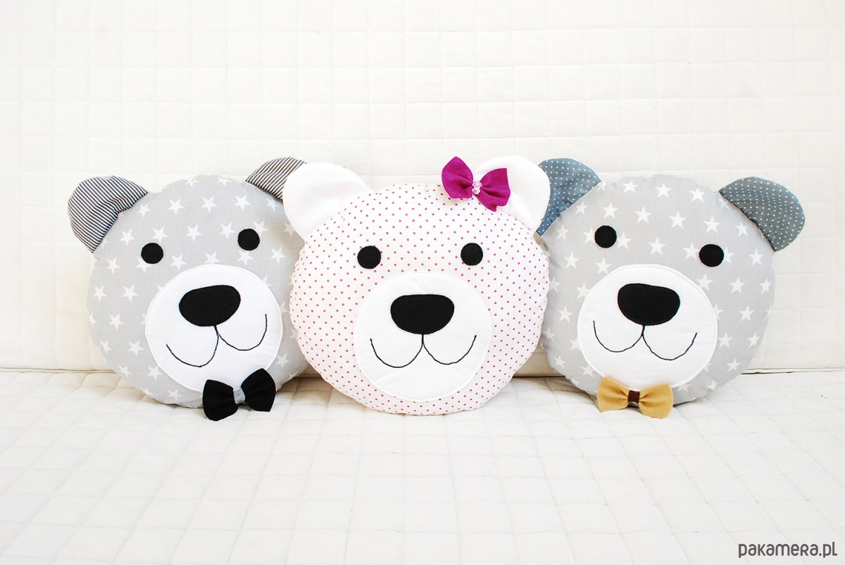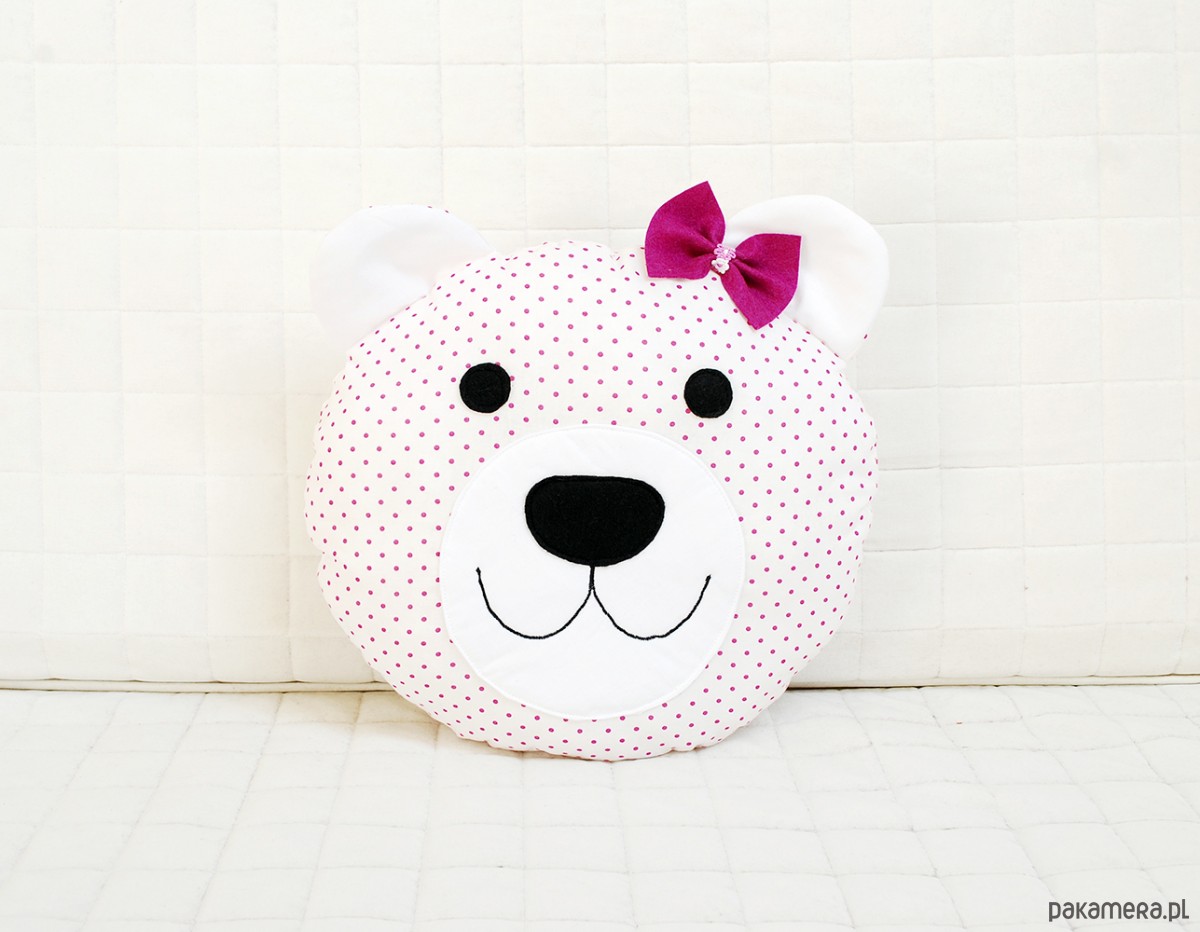 Poduszka w kształcie misia uszyta z bawełnianych tkanin i filcu. Wypełniona antyalergicznym włóknem. Przy uszku miś posiada filcową kokardkę. Średnica poduszki ok.33cm