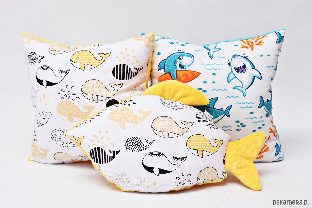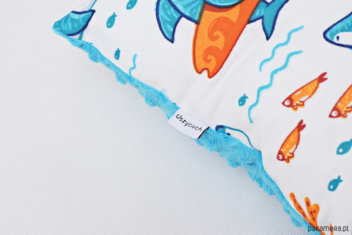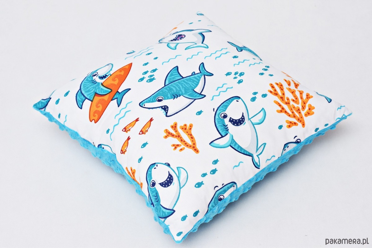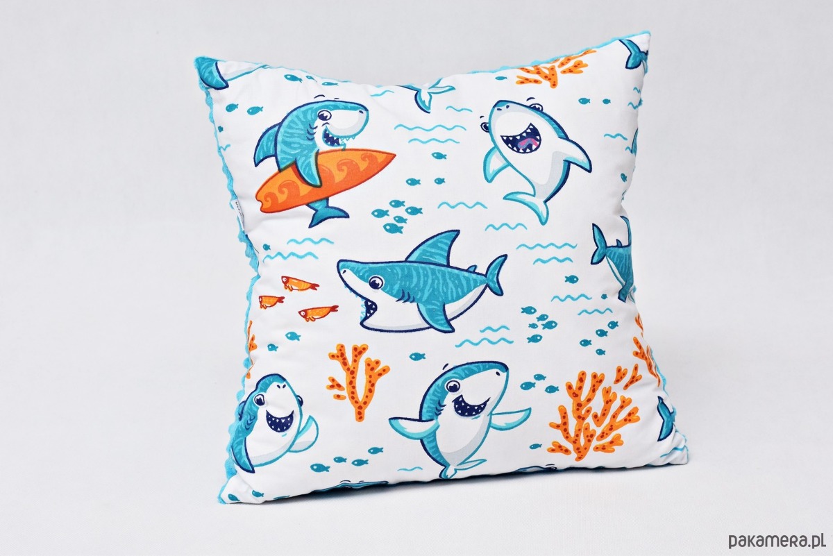 Stylowa ozdobna poduszka uszyta z bawełny 100% z wzorem w rekiny i z mięciutkiego polaru minky w kolorze błękitnym.