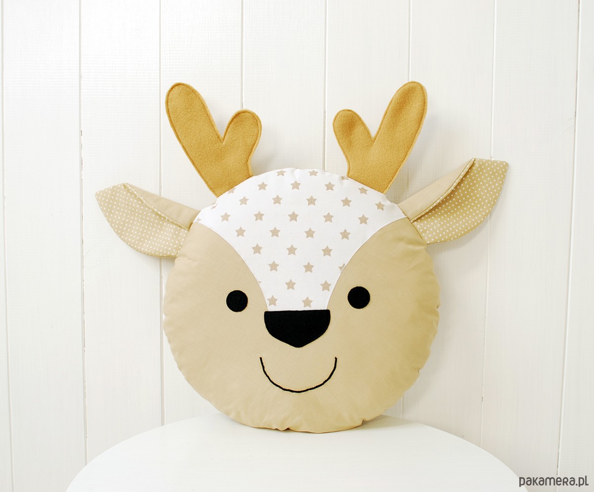 Miękka poduszka jelonek uszyta z bawełnianych tkanin oraz filcu. Całość dobrze wypełniona antyalergiczną kulką silikonową.