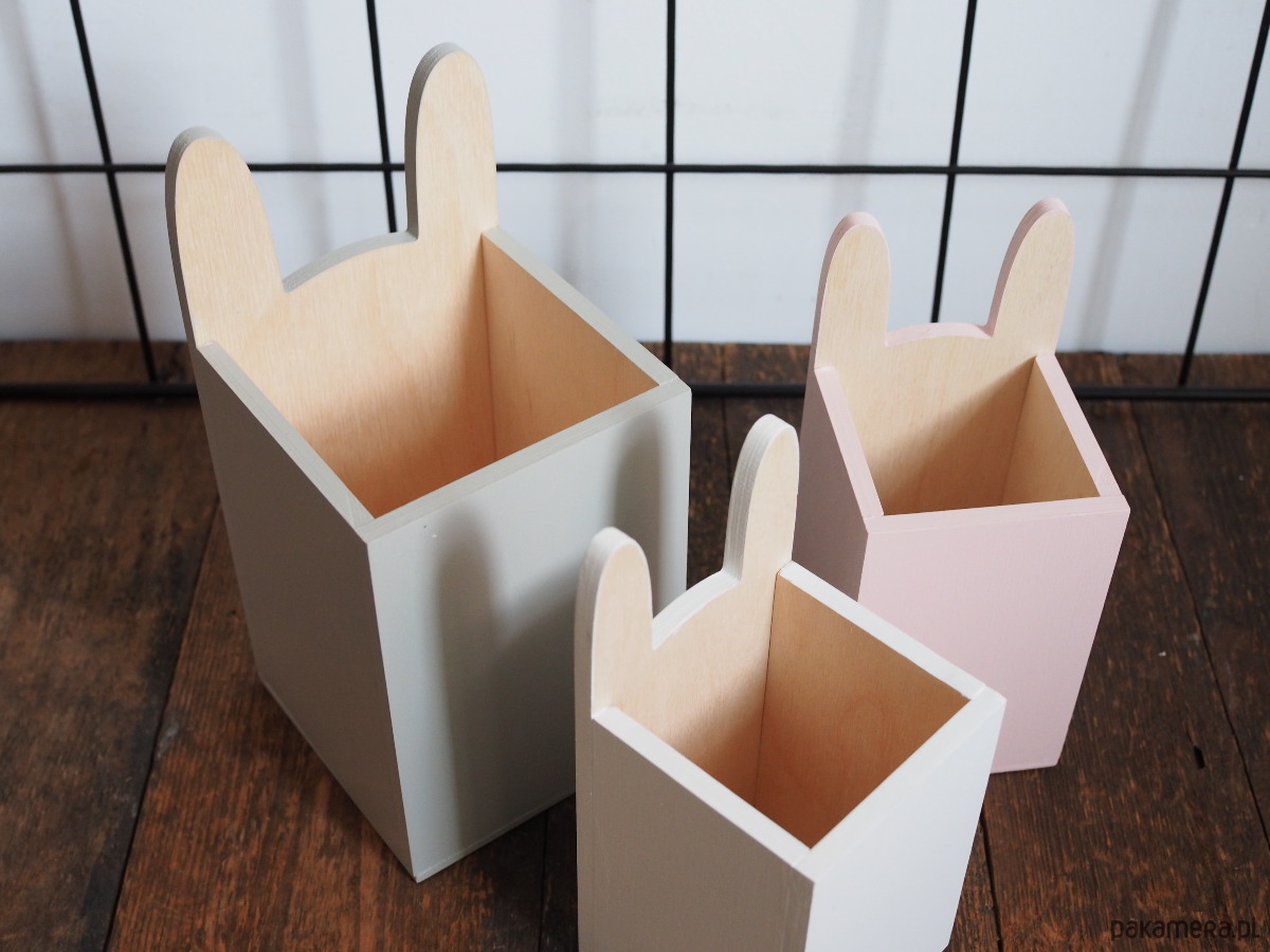 Pojemnik na kredki lub inne przybory artystyczne, wykonane z drewna, pomalowane farbami akrylowymi, do wyboru jeden z trzech kolorów i dwóch rozmiarów: