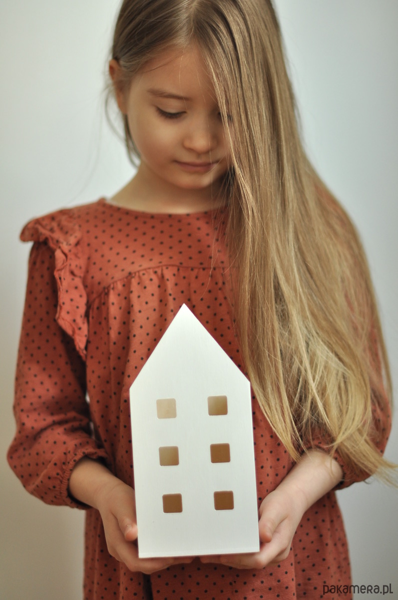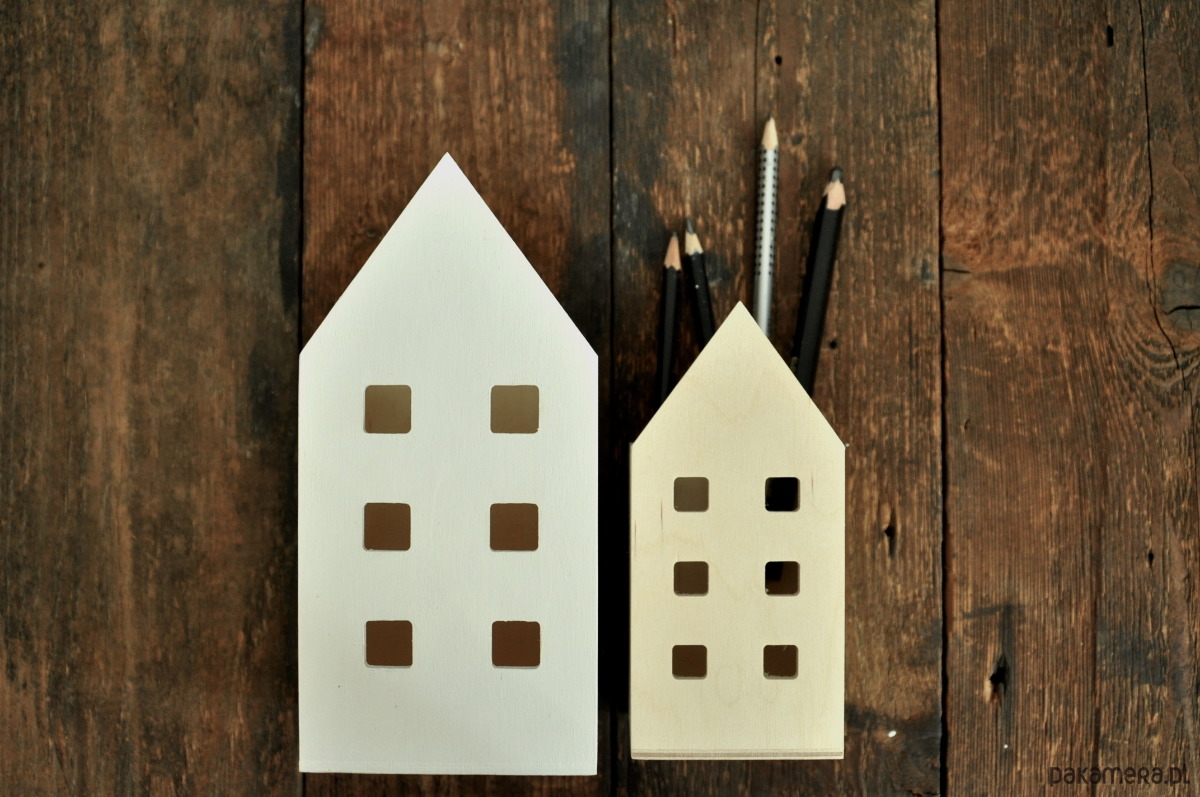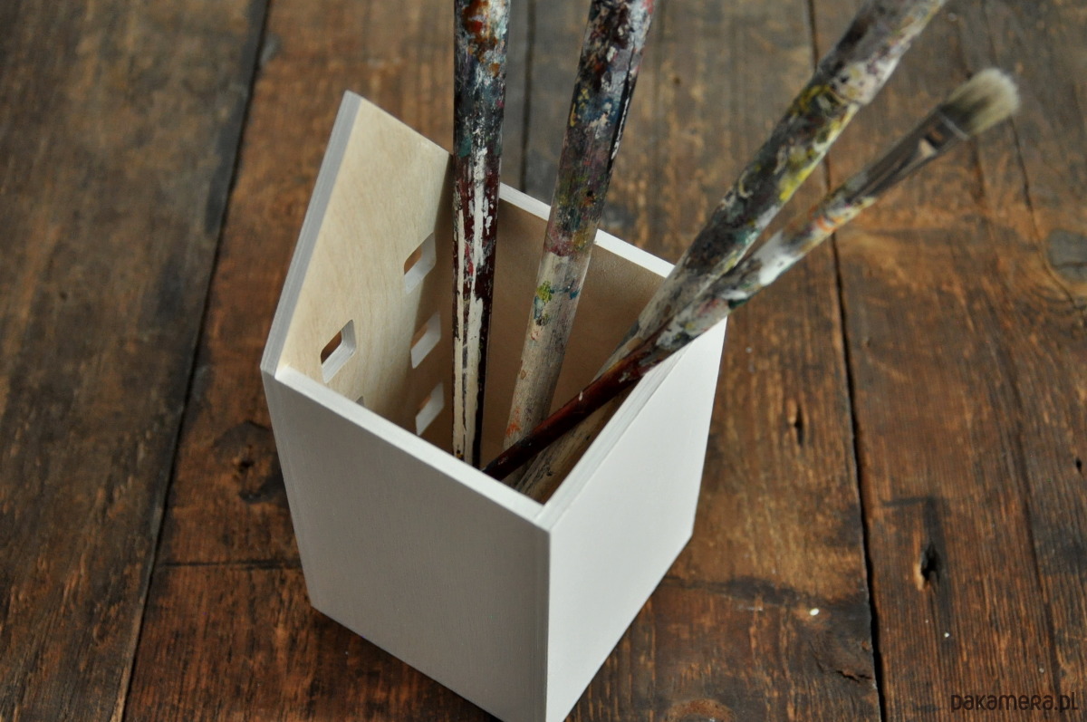 Pojemnik na kredki lub inne przybory artystyczne, wykonany z drewna, pomalowany białą farbą akrylową lub akrylowym lakierem bezbarwnym (do wyboru).