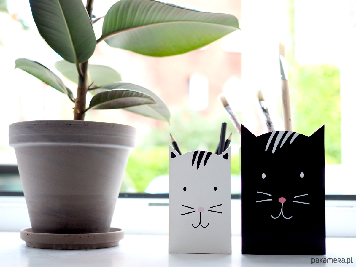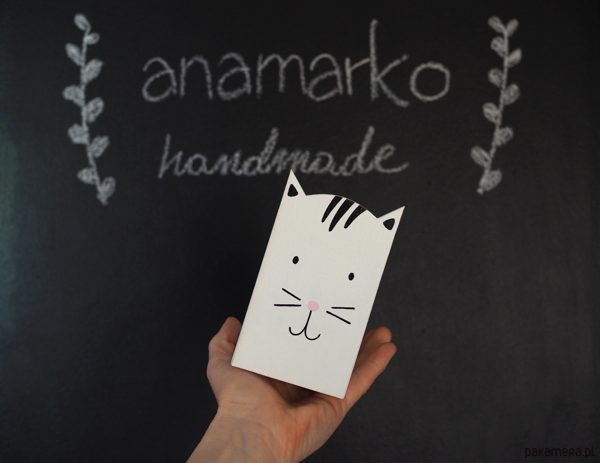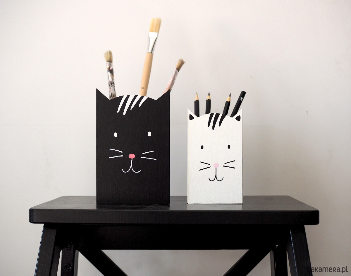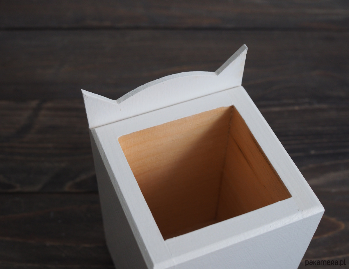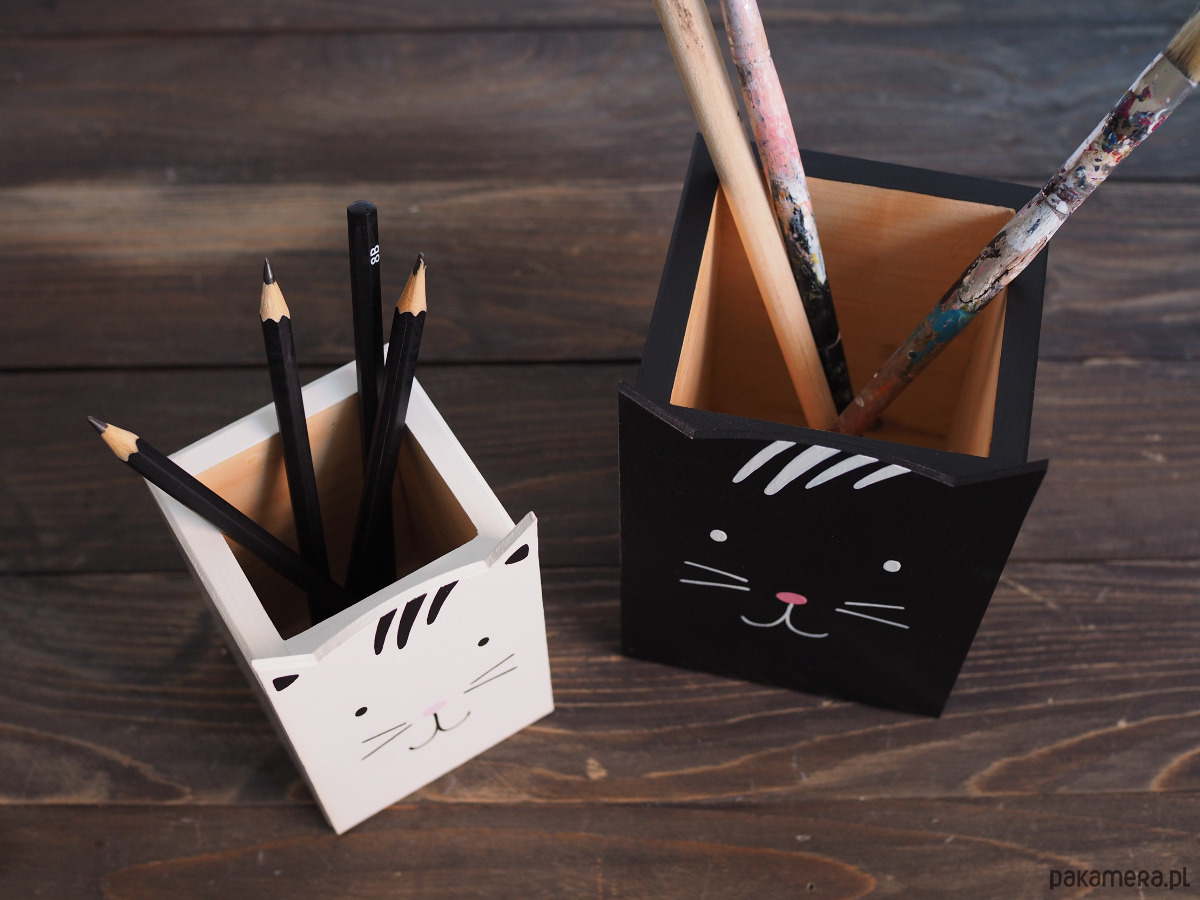 Pojemnik na kredki lub inne przybory artystyczne, wykonane z drewna, pomalowane farbami akrylowymi.