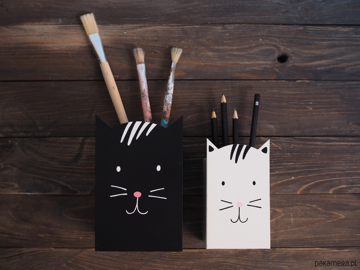 Pojemnik na kredki lub inne przybory artystyczne, wykonane z drewna, pomalowane farbami akrylowymi.