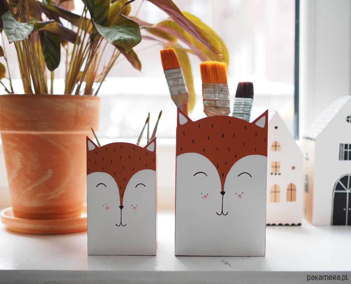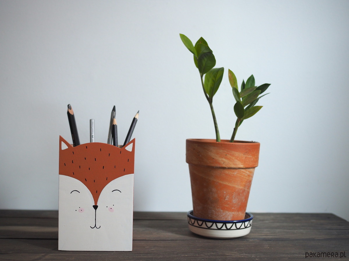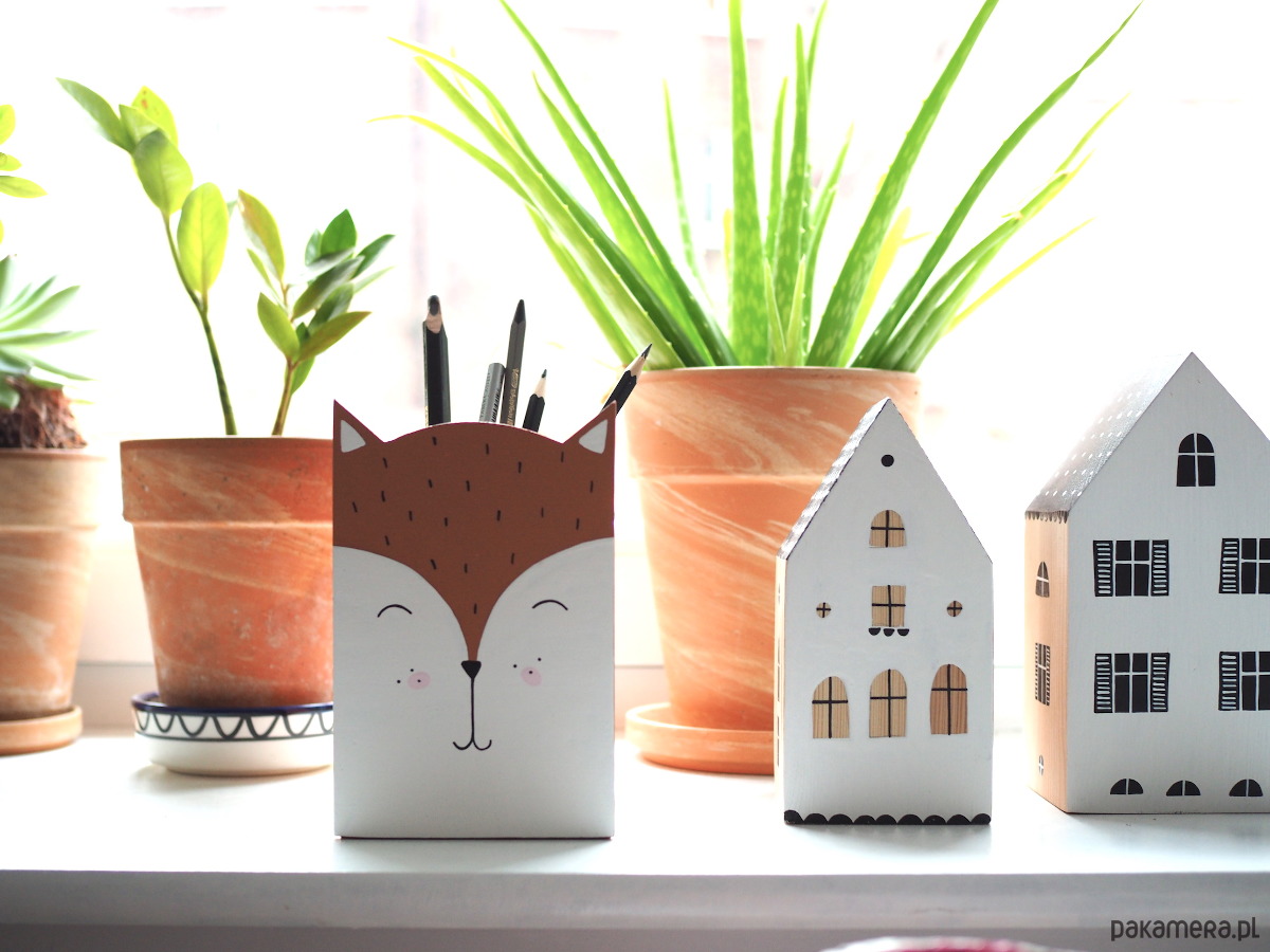 Pojemnik na kredki lub inne przybory artystyczne, wykonane z drewna, pomalowane farbami akrylowymi.
