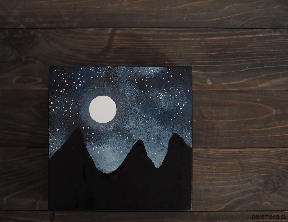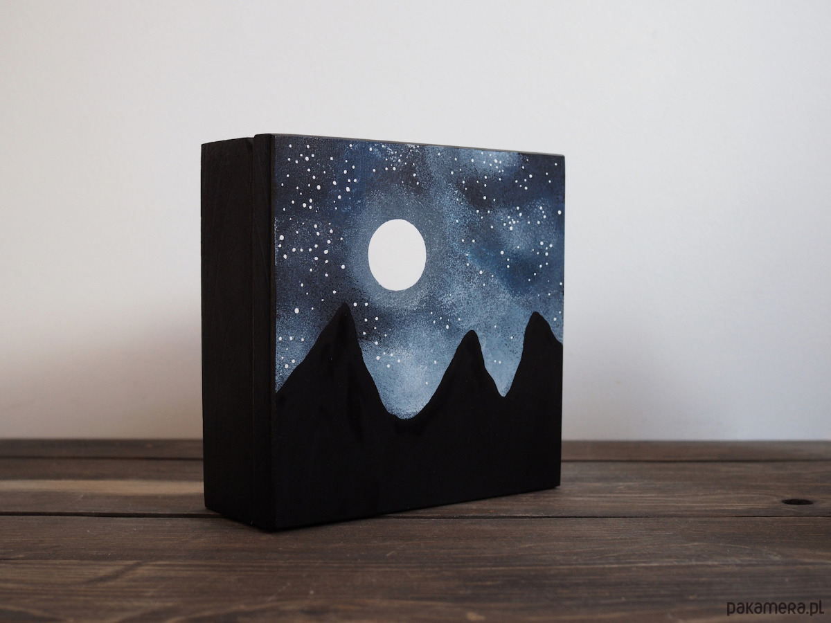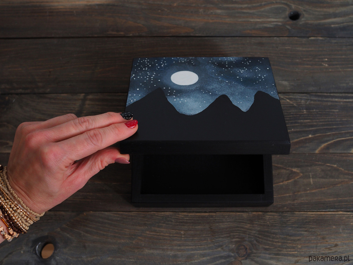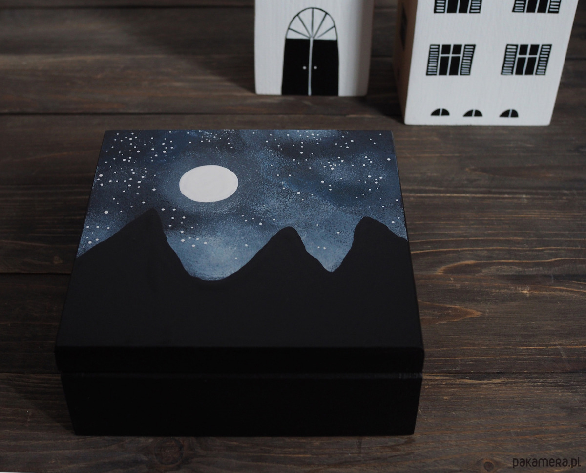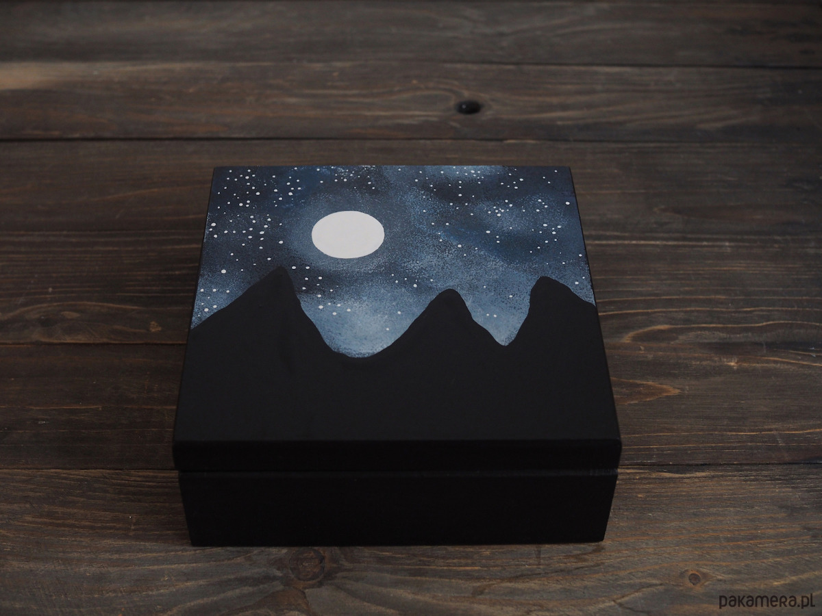 Pudełko wykonane z drewna, pomalowane ręcznie farbami akrylowymi, o wymiarach wewnętrznych 13x13 cm, wymiary zewnętrzne 15x15 cm wys. całkowita 6cm.