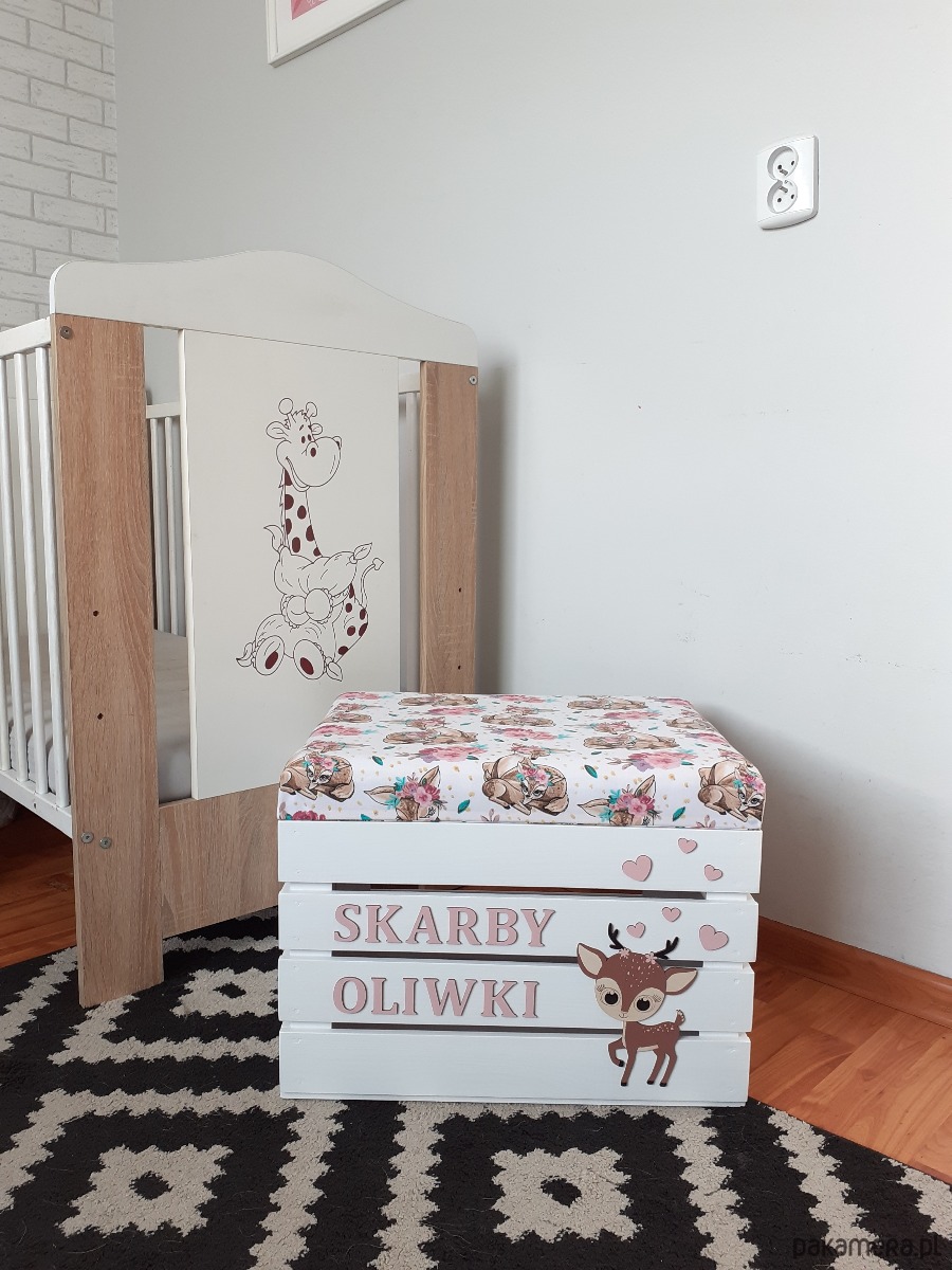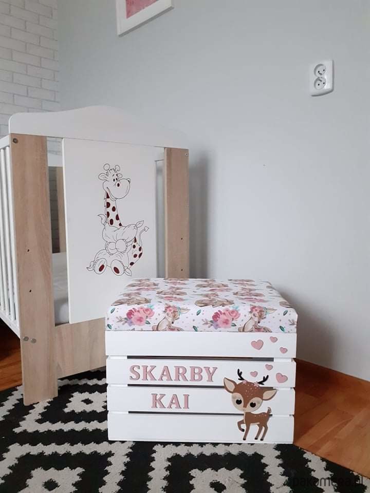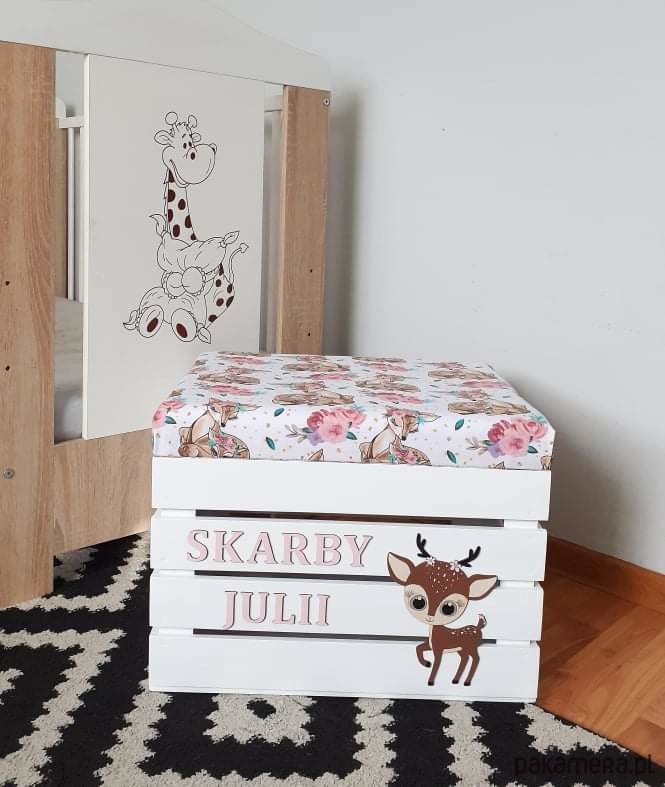 Na skrzyni znajduje się imię dziecka: napis może być dowolny (maksymalnie 20 liter). Przy składaniu zamówienia prosimy o podanie imienia dziecka.