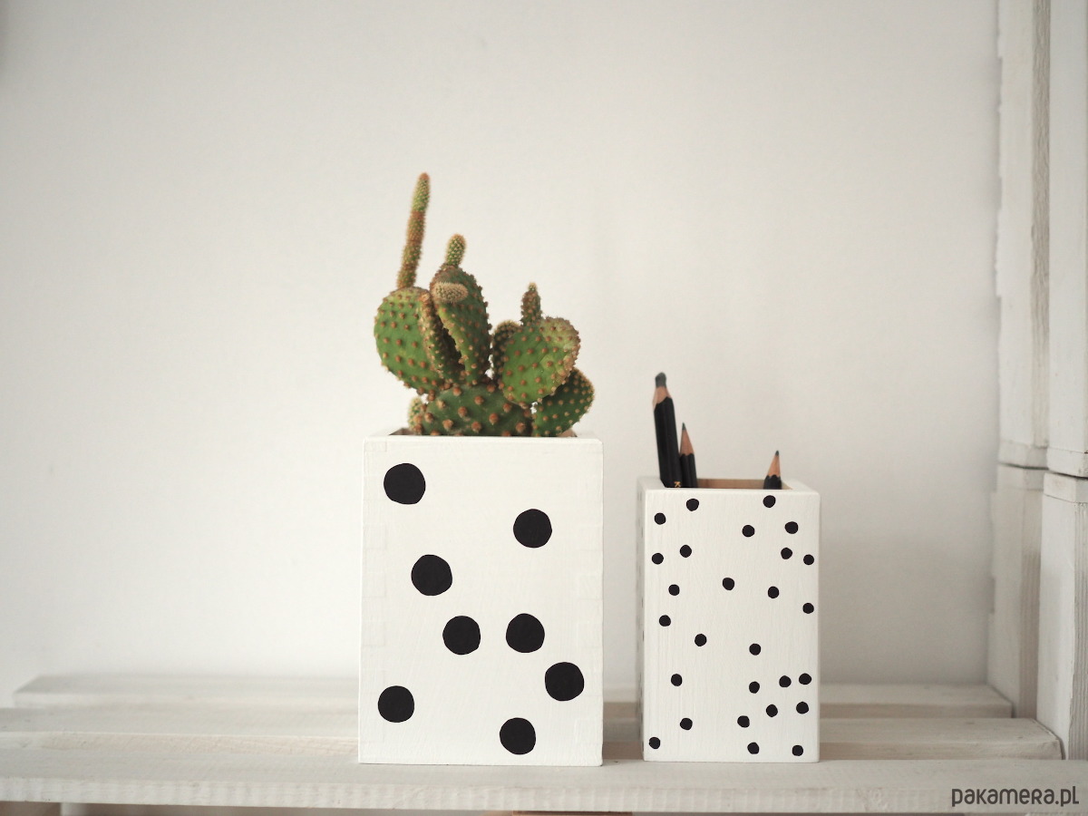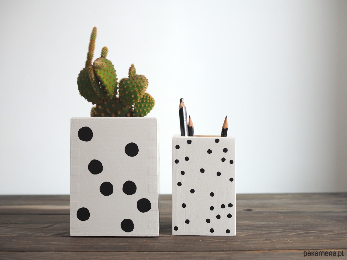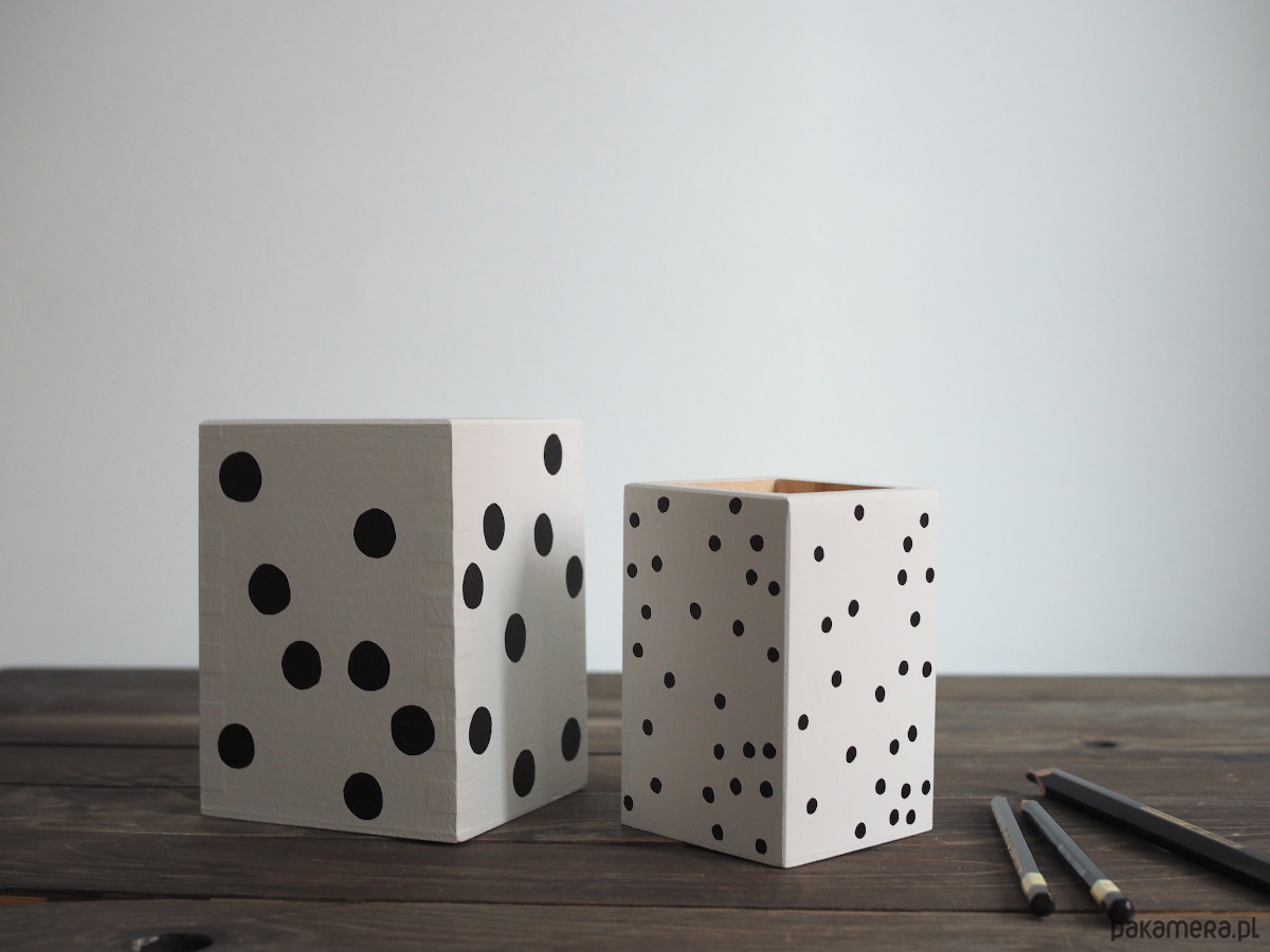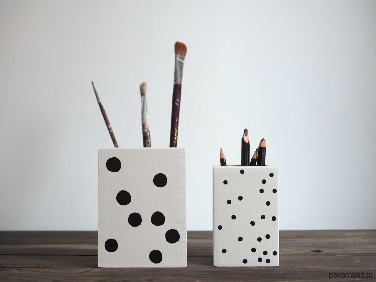 Pojemnik na kredki w kropeczki, wykonane z drewna, pomalowane farbami akrylowymi, w dwóch rozmiarach do wyboru.