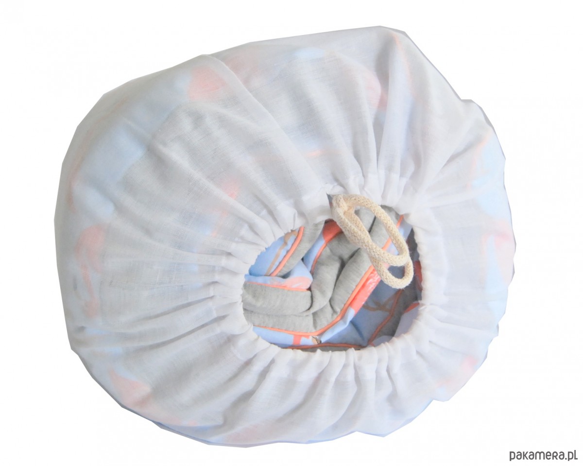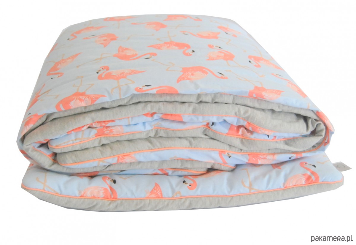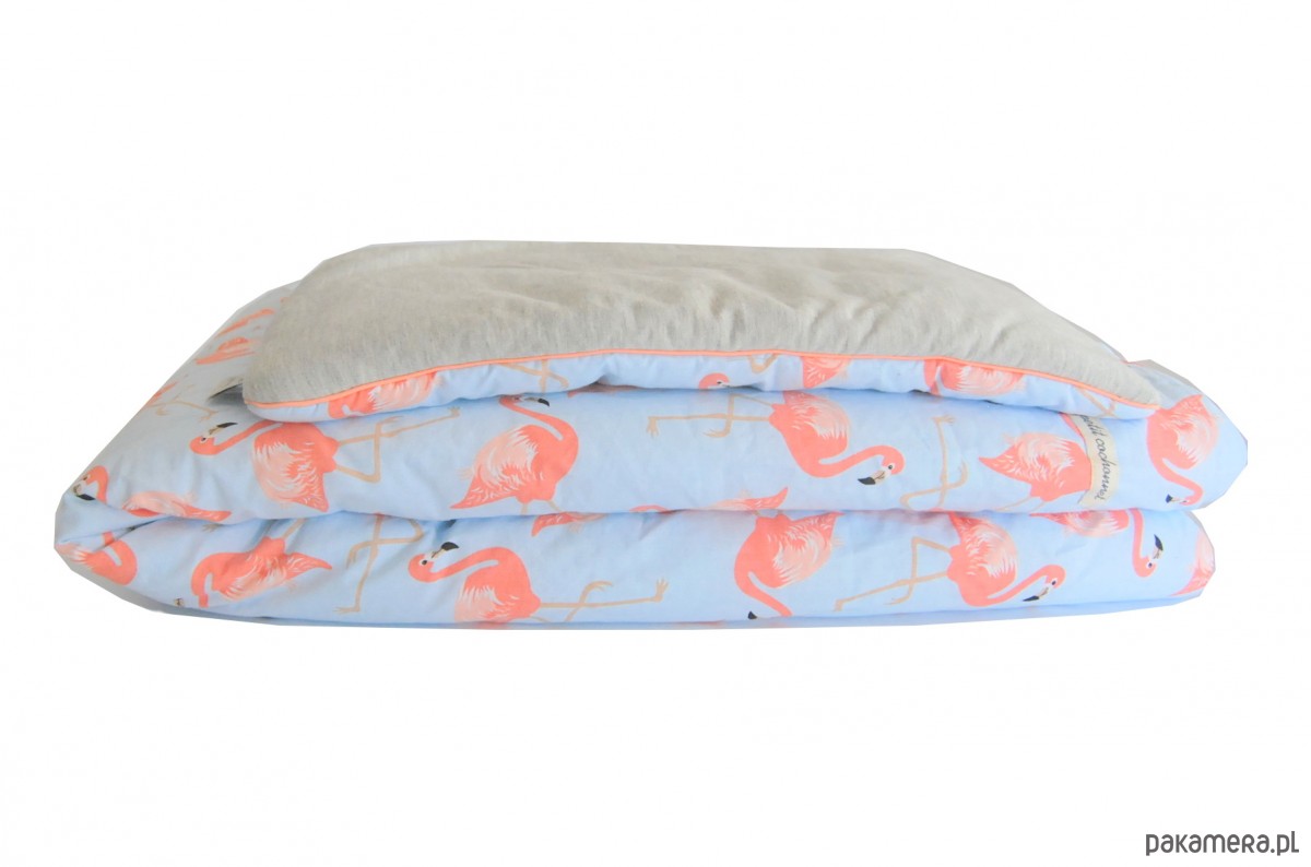 Zestaw pościeli dwustronnej z wypełnieniem do łóżeczka, składa się z 3 elementów: kołderki, poduszki i worka. Pościeli stanowi piękną dekorację dziecięcego pokoju, sprawdza się idealnie na wyjazdach lub w przedszkolu podczas leżakowania. Wymiary: kołderka 100*135 cm, poduszka 35*50 cm (rozmiar odpowiedni dla dzieci od 0-5 lat). Skład: 100% bawełna, wypełnienie włóknina silikonowa, antyalergiczna. Tkaniny zostały wyprodukowane w Polsce, posiadają certyfikaty Oeko-Tex 100 (Tekstylia Godne Zaufania) i są bezpieczne dla dzieci. Pielęgnacja: prać w pralce w temperaturze 40 st. C, wirowanie 800 obr./min., prasować temp. do 150 st.C, nie wybielać, nie suszyć w suszarce. Kolor: szara dzianina, tkanina błękitna/flamingi, morelowa wypustka. Pościel wykonana w Polsce! Realizacja zamówienia 14 dni.