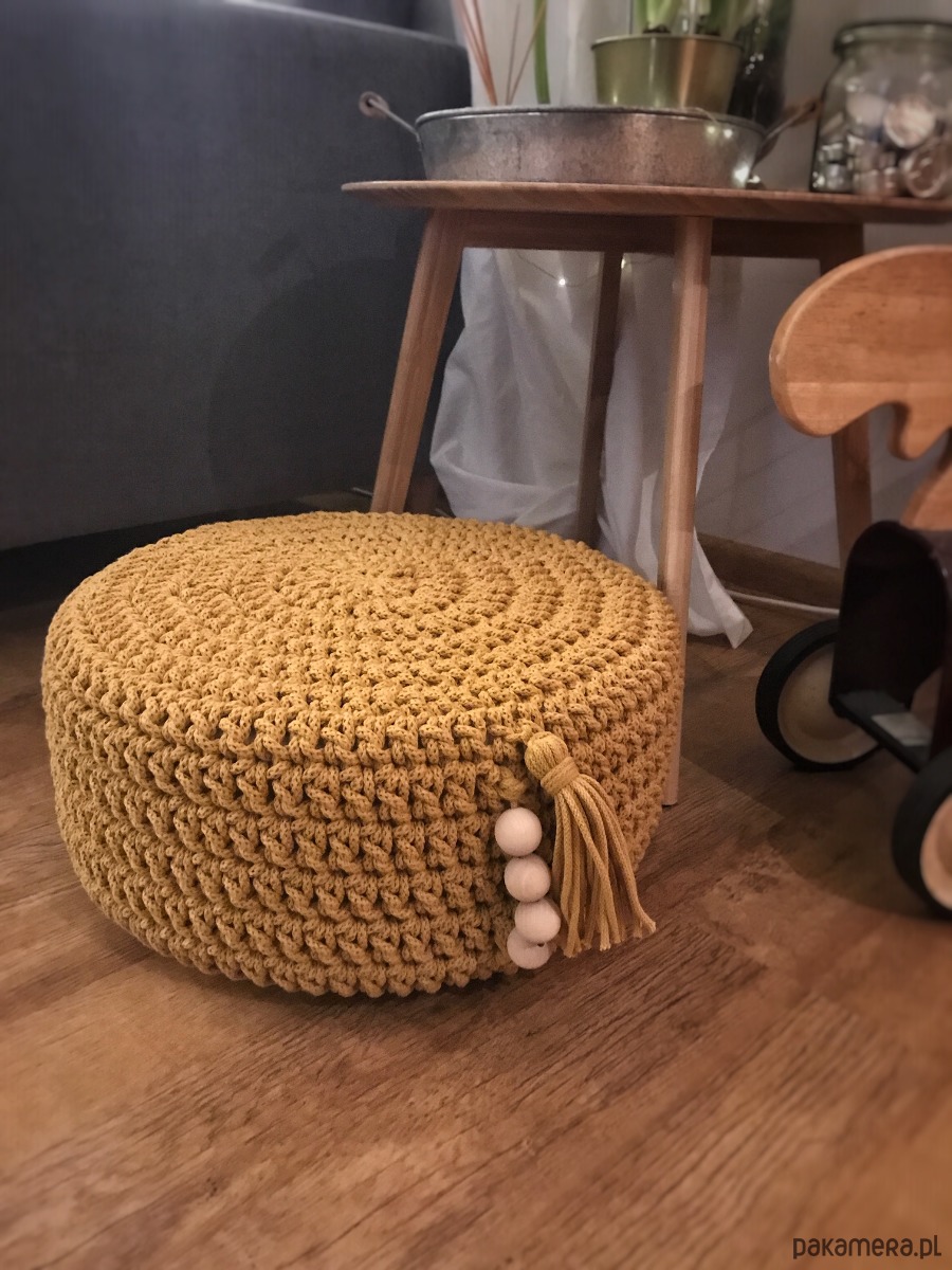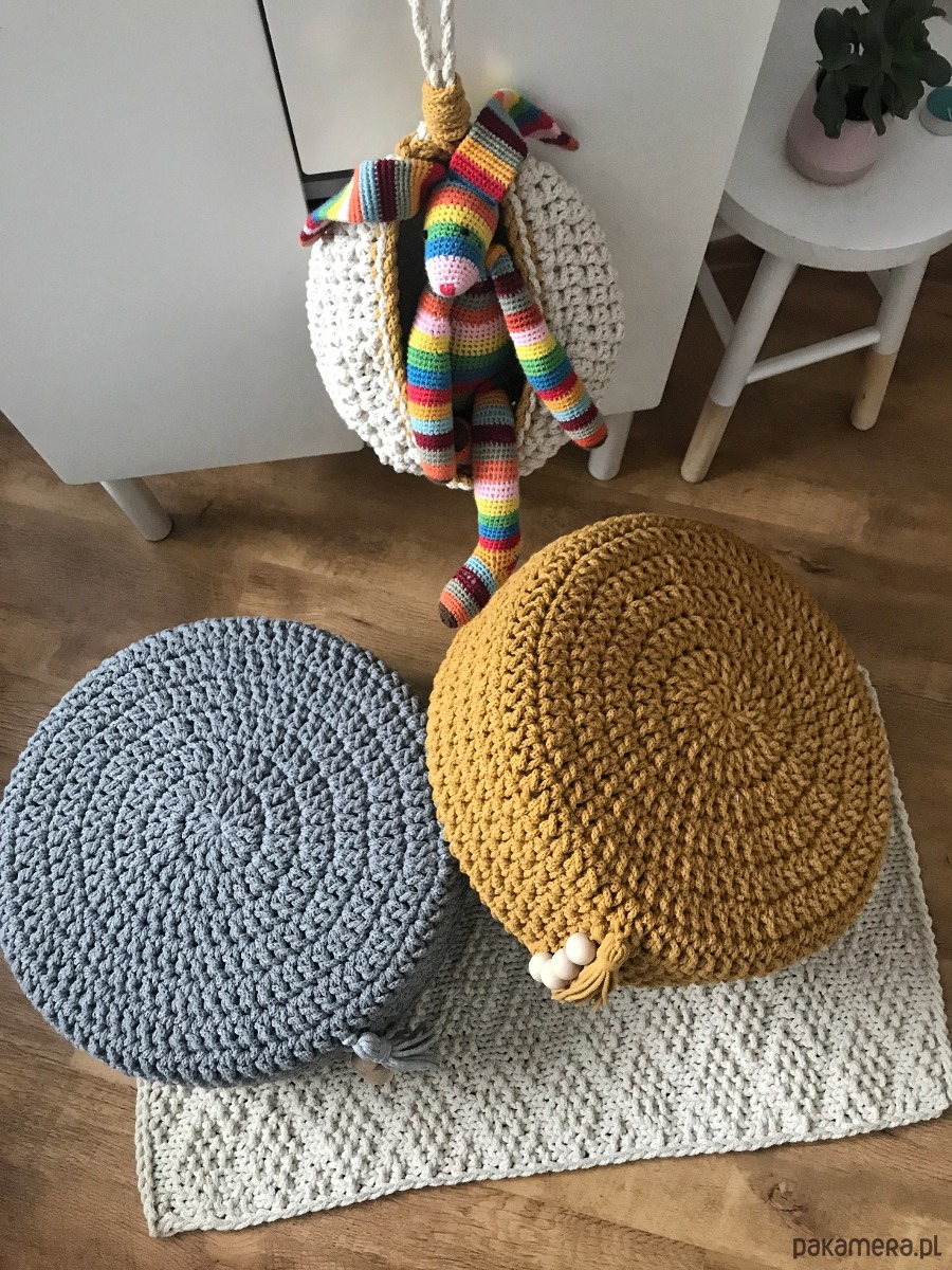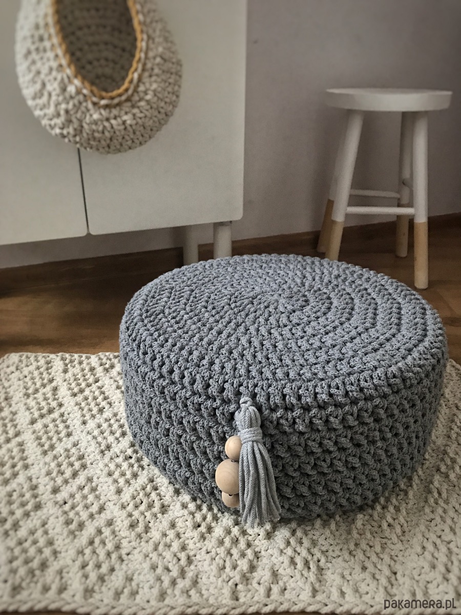 Poducha, siedzisko , pufa, okrągła i wygodna wykonana z bardzo grubego sznura produkowanego na indywidualne zamówienie. Dzięki wyrazistemu ściegowi i kolorowi, będzie stanowiła też prawdziwie dekoracyjny, zwracający uwagę element.