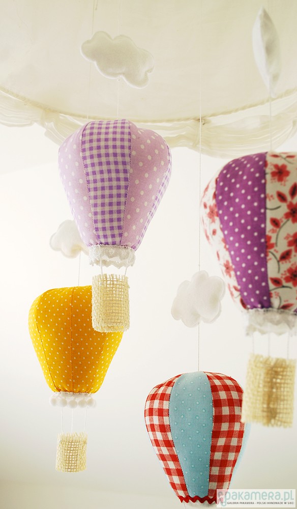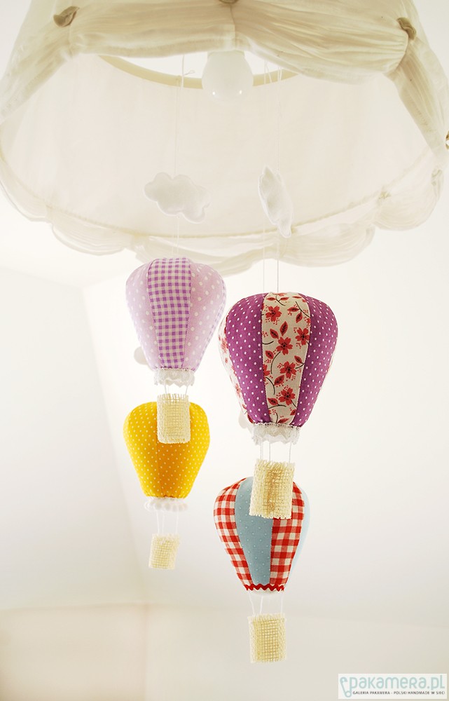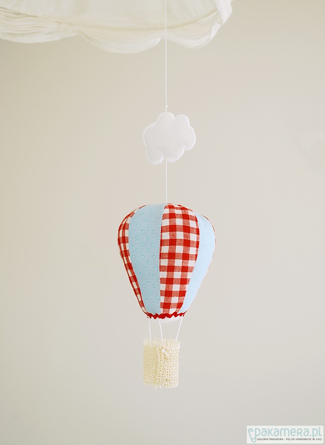Balon wykonany z bawełnianych tkanin i filcu, na dole wykończony tasiemką. Wypełniony antyalergicznym włóknem. Zawieszany na długim (ok. 70cm), białym sznureczku. Nad balonem dołączona jest filcowa chmurka. Wymiary: ok. 21x11cm