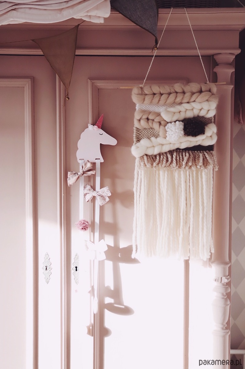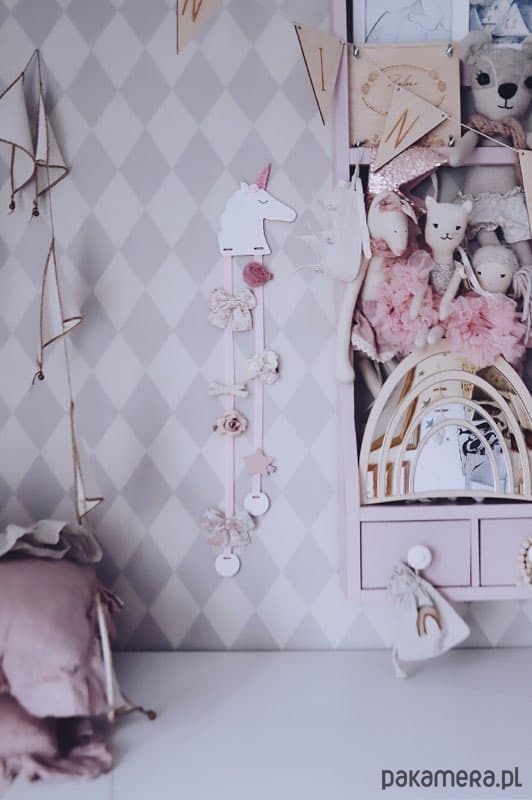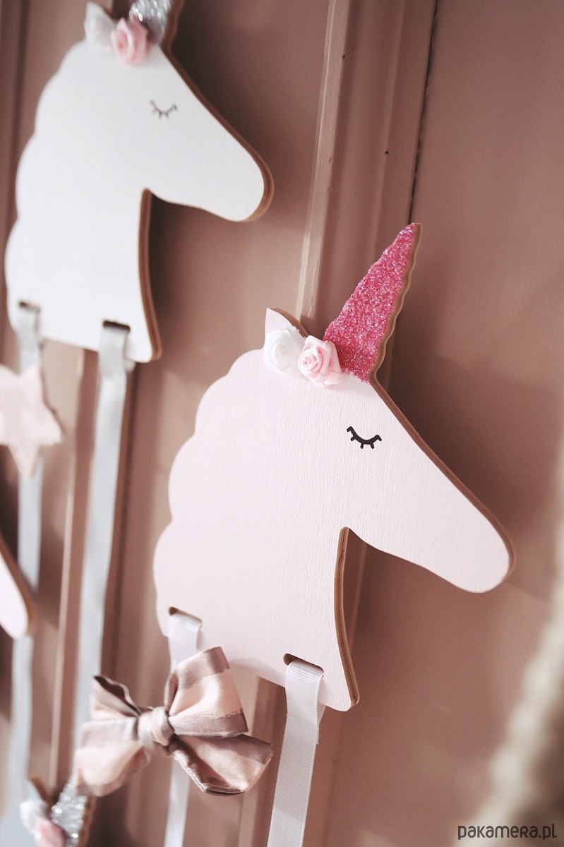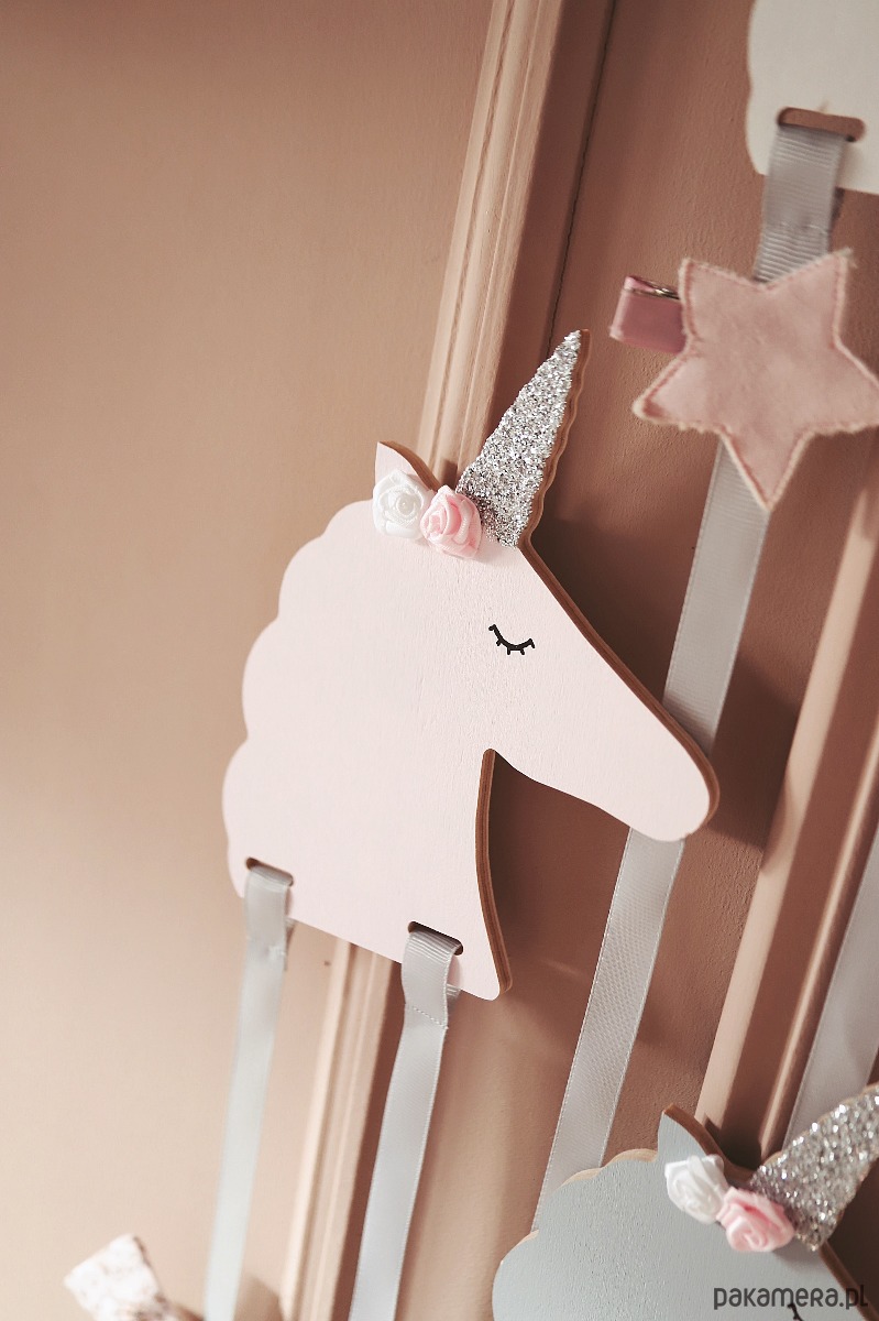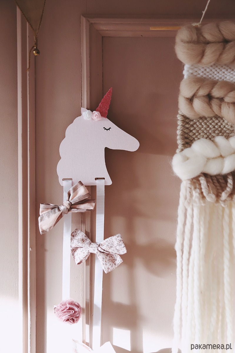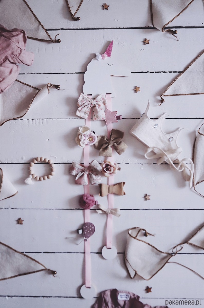 Organizer posiada tasiemki rypsowe do których przypinamy spineczki. Jednorożec jest malowany farbą akrylową z atestem w delikatnym różowym kolorze. Organizer mocujemy za pomocą dołączonej taśmy dwustronnej do ściany, drzwi czy mebli.