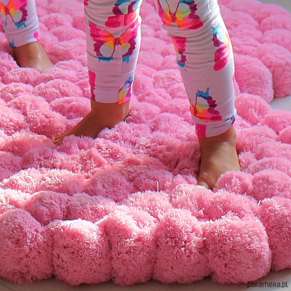 Dywan wykonany jest z pomponów o średnicy 10 cm i taka jest grubość dywanu - czysta przyjemność chodzenia, a przy większych rozmiarach leżenia, ponieważ można traktować je jak matę odpoczynkową.