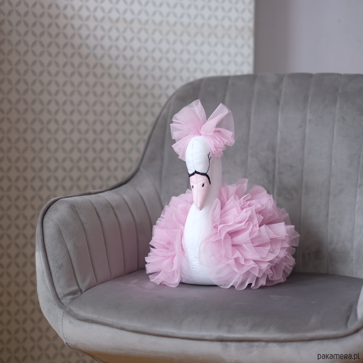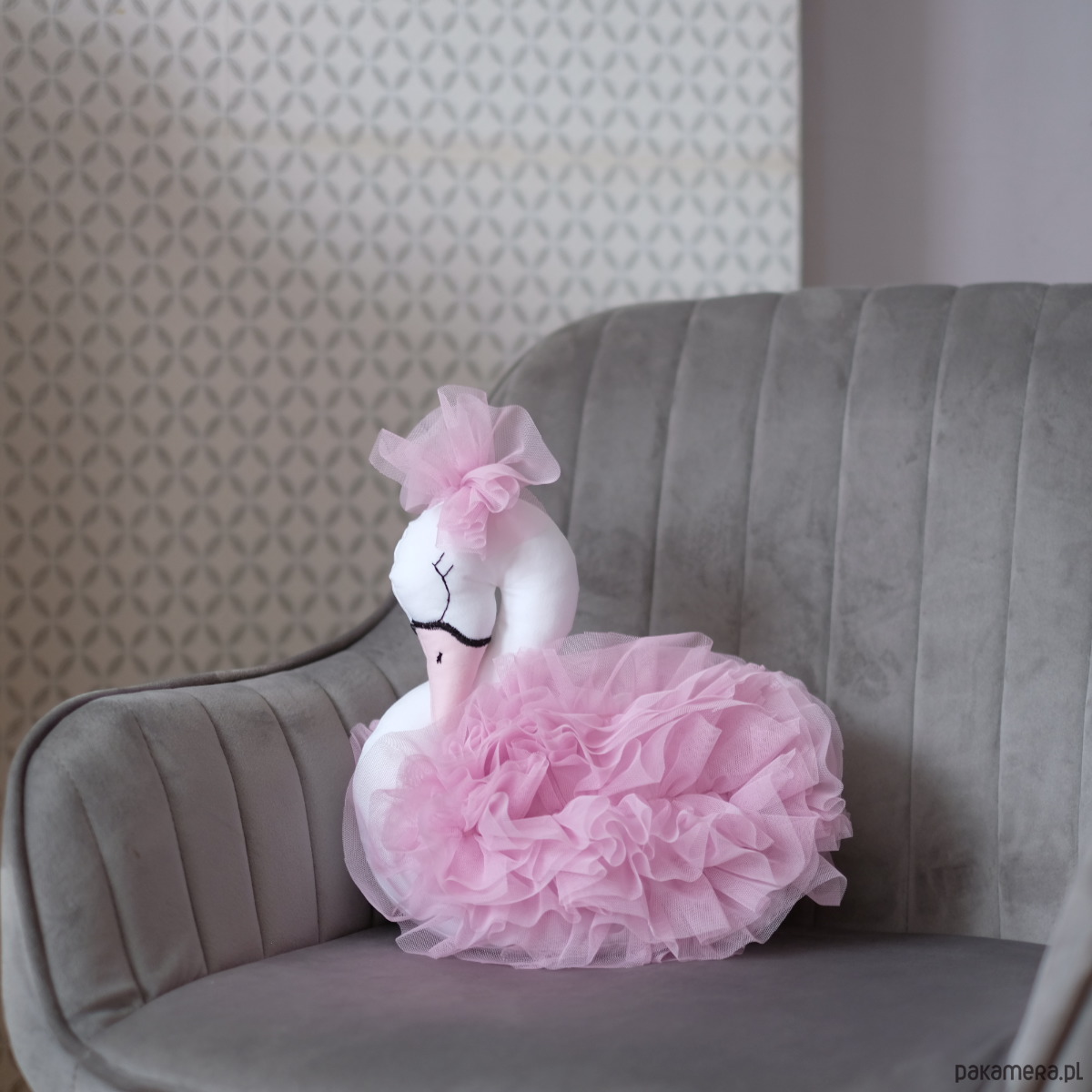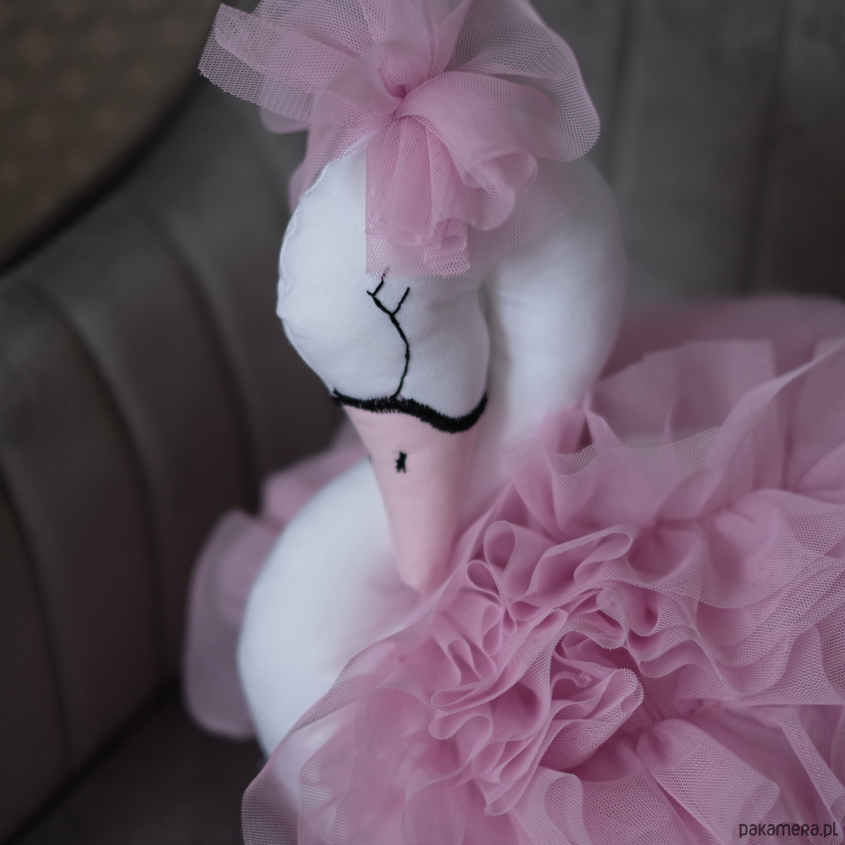Przytulanka lub dekoracja do pokoju dziecięcego. Łabędź wykonany w całości ręcznie z wyhaftowanymi oczami. W formacie 3D i dbałością o szczegóły. Tkanina użyta do produktu to wysokogatunkowa bawełna koloru białego i różowego oraz miękki tiul z wypełnieniem sylikonowym, antyalergicznym.