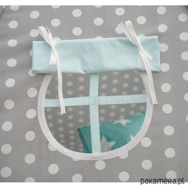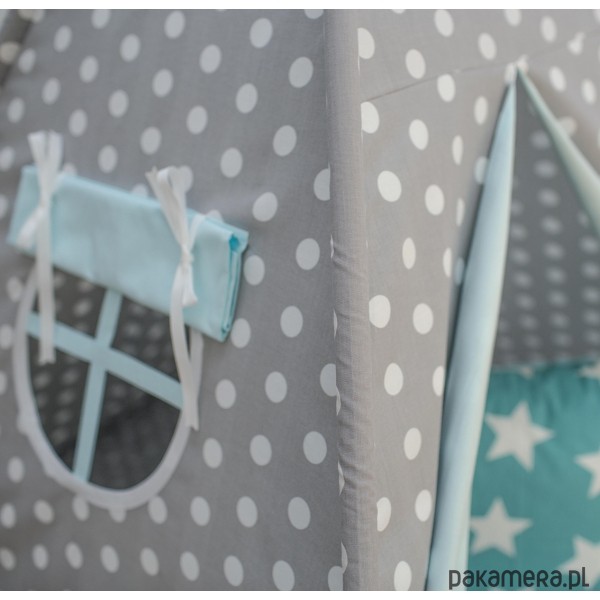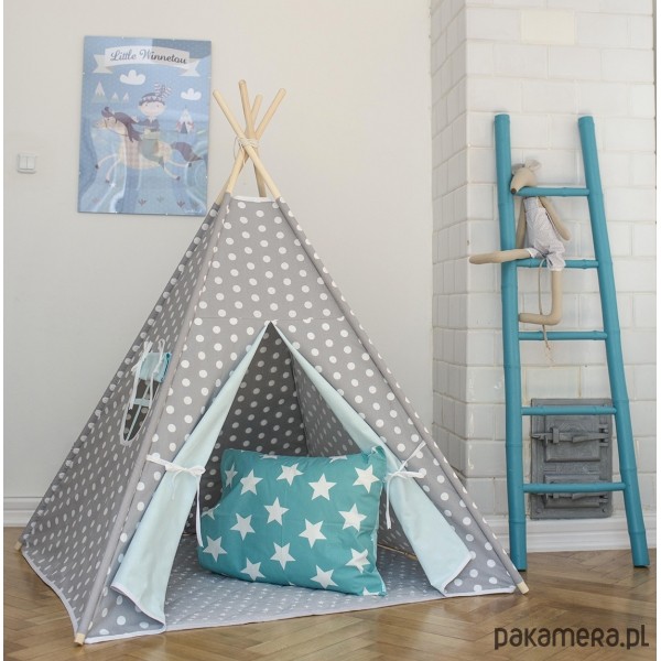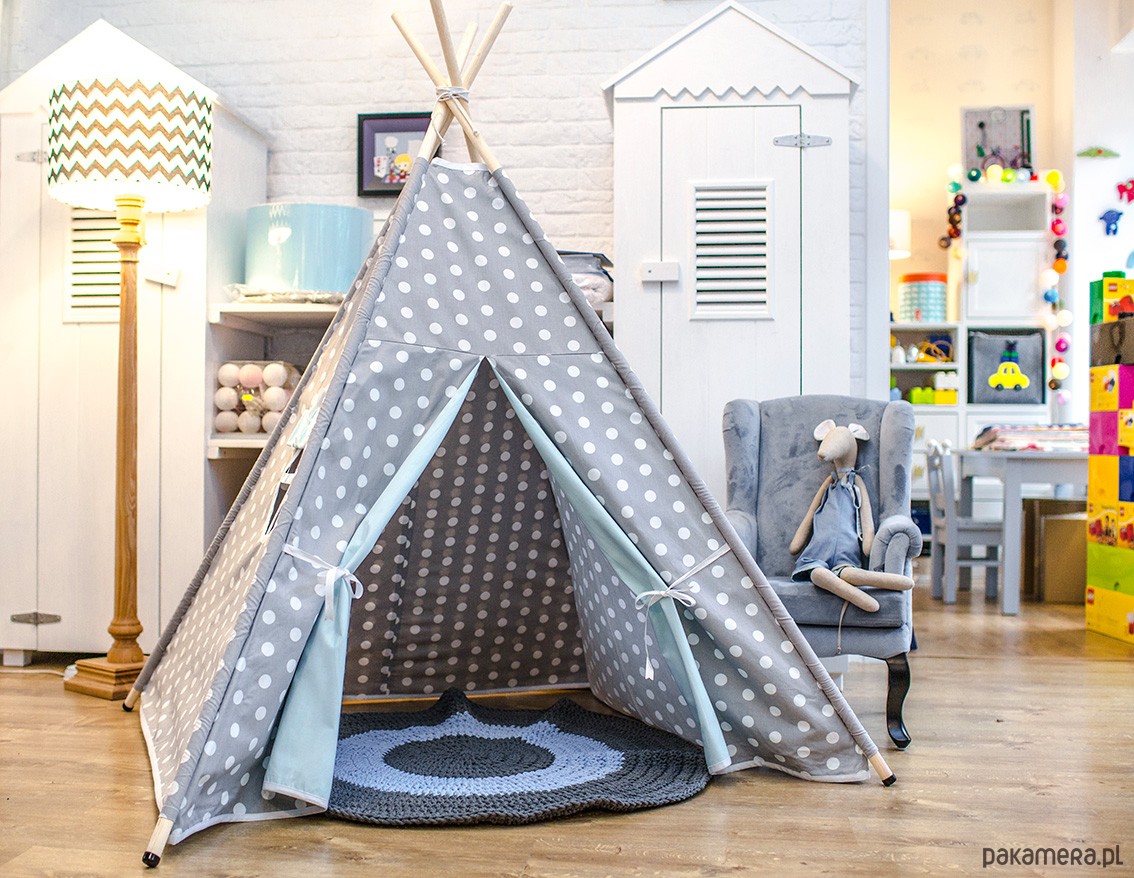 TeePee wykonane jest z naturalnych materiałów, przyjaznych dzieciom. Doskonale komponuje się w pokoju dziecięcym jak i w salonie, nadając mu przytulny klimat, który sprzyja twórczej zabawie. Latem można rozstawić go w ogrodzie lub na plaży, zapewniając dziecku schronienie przed słońcem. Prosta konstrukcja umożliwia łatwe złożenie i przeniesienie namiotu w dowolne miejsce. W przypadku zabrudzenia pokrowca TeePee, można go zdjąć ze stelaża i wyprać, dzięki czemu będzie służył przez długi czas. Tkanina: Szara bawełna w jasne grochy. Namiot posiada okienko z zasłonką. Wymiary: Długość stelażu : 180cm Powierzchnia podstawy : 1,2 m2 Wysokość namiotu : 135 cm Stelaż wykonany z drewna. Całość opakowana w tekturową tubę.