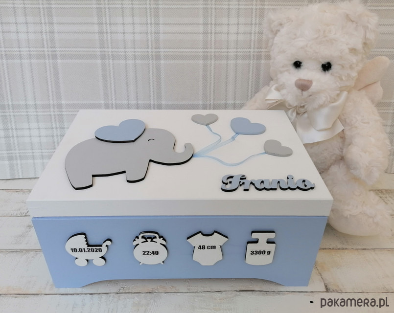 Na wieczku pudełka, które zostało pomalowane na biały kolor znajduje się szary słonik oraz imię dziecka.