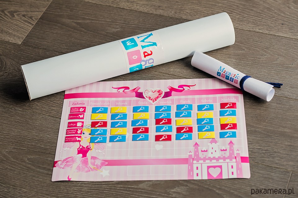 Tablica motywacyjna dla dziewczynki - Magnetic Words Tablica motywacyjna Ma na celu zmotywować nasze dziecko oraz nas do systematyczności. Jest to tablic, która przez zabawę uczy jak poprawić zachowanie naszego dziecka. Jak pokazać mu, że codzienne obowiązki nie muszą być nudne. Skrócona instrukcja obsługi: 1.Powieś tablicę w widocznym miejscu 2.Wspólnie z dzieckiem wybierzcie zadania na bieżący tydzień 3.Pozwól dziecku umieścić zadania na tablicy 4.Na koniec każdego dnia oceń wykonanie zadania poprzez przyklejenie znaczników w odpowiednich kolorach 5.Na koniec tygodnia, wspólnie policzcie punktu 6.Nagrodź dziecko Tablica zawiera: 1.Tablica magnetyczna z planem tygodnia 2.Przykładowe znaczniki z opisem zadań: -lekcje -ubierz się -umyj zęby -rozpakuj plecak -wynieś śmieci -ładny rysunek -posprzątaj talerze -wyprowadź psa na spacer -ćwiczenia logopedyczne -schowaj ubrania -umyj ręce -pomóż mamie -dwa puste znaczniki do wpisania własnych motywacji 3.Kolorowe znaczniki za wykonane zadania: -42 niebieskich -21 żółtych -15 czerwonych 4.Pisak