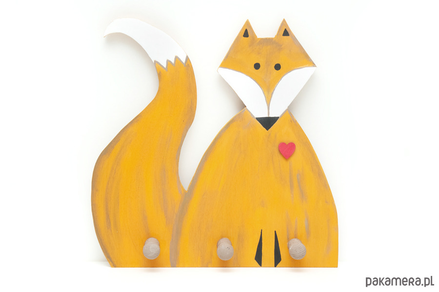 Drewniany wieszak wycinany ręcznie z drewnianej sklejki. Wieszak ma trzy drewniane uchwyty. Jest malowany ręcznie farbami akrylowymi. Wieszak został polakierowany kilkakrotnie. Rozmiar zewnętrzny to ok. 27 cm (dół) x 29,5 cm(w najwyższym miejscu) x 1 cm. Z tyłu zamocowane są wieszaki wciskowe służące do zamocowania całego wieszaka na ścianie.