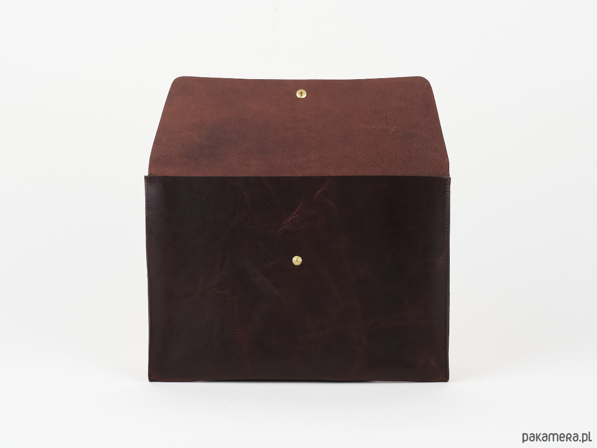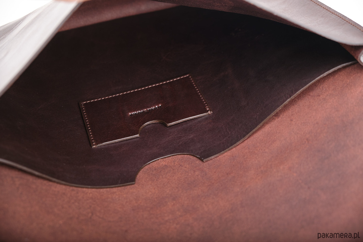 Etui wykonane jest z grubej skóry garbowanej roślinnie, w Polsce. Jest sztywne oraz trzymające swój kształt. Świetnie sprawdzi się również jako aktówka, teczka na dokumenty, czy duża kopertówka.