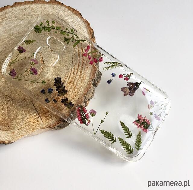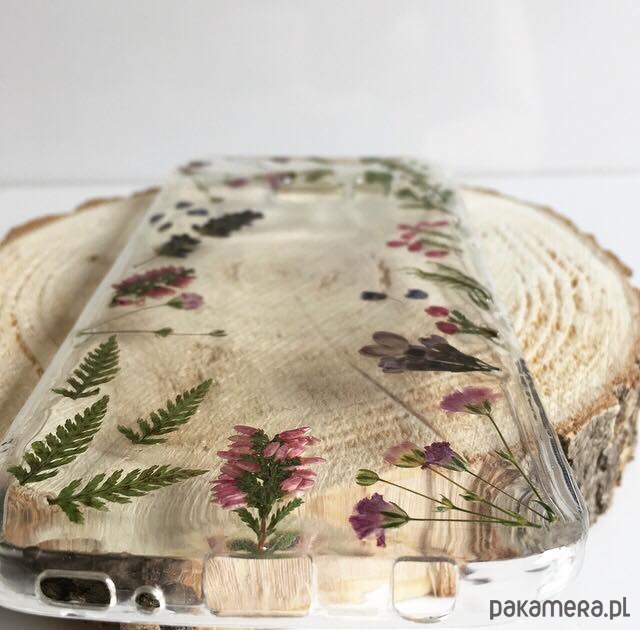 Etui z suszonymi roślinami w leśnym wydaniu-paprocie, wrzosy, lawenda, tasznik pospolity i mchy. Nadaj swojemu telefonowi niecodzienny charakter.