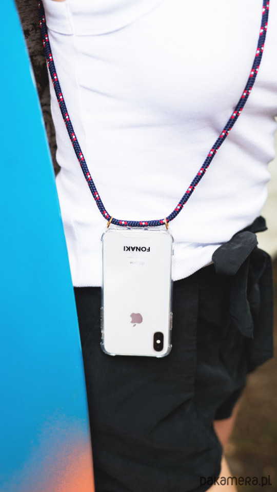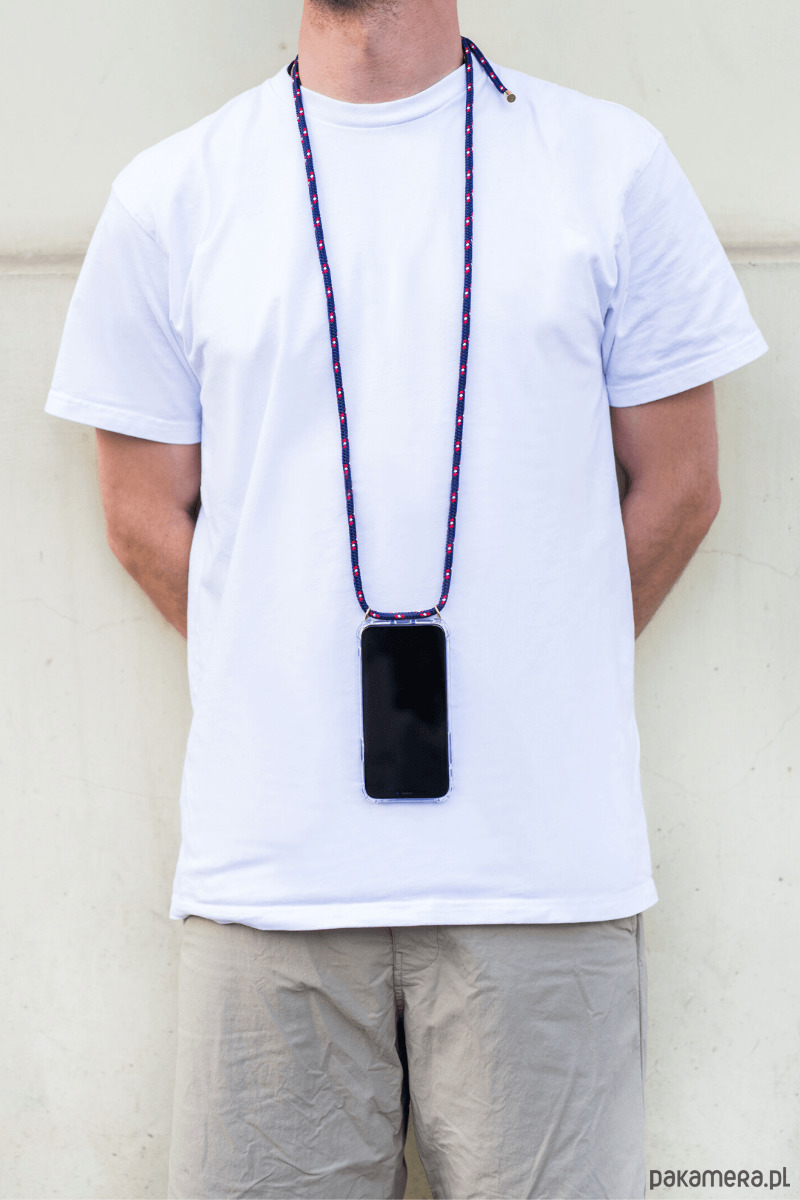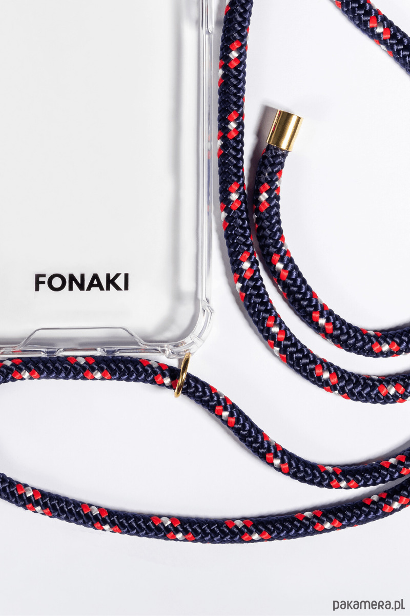 Etui Fonaki wykonane jest z przezroczystego tworzywa sztucznego z zamocowanym ozdobnym sznurkiem o średnicy 6mm z możliwością regulacji długości. Telefon w etui można nosić jak torebkę przez ramię albo na szyi jako zawieszkę. Sznurek Royal Navy w kolorze granatowo-czerwono-białym zakończony jest złotymi, metalowymi okuciami z grawerem FONAKI. Odporny na zabrudzenia, nie absorbuje wody, szybko schnie.