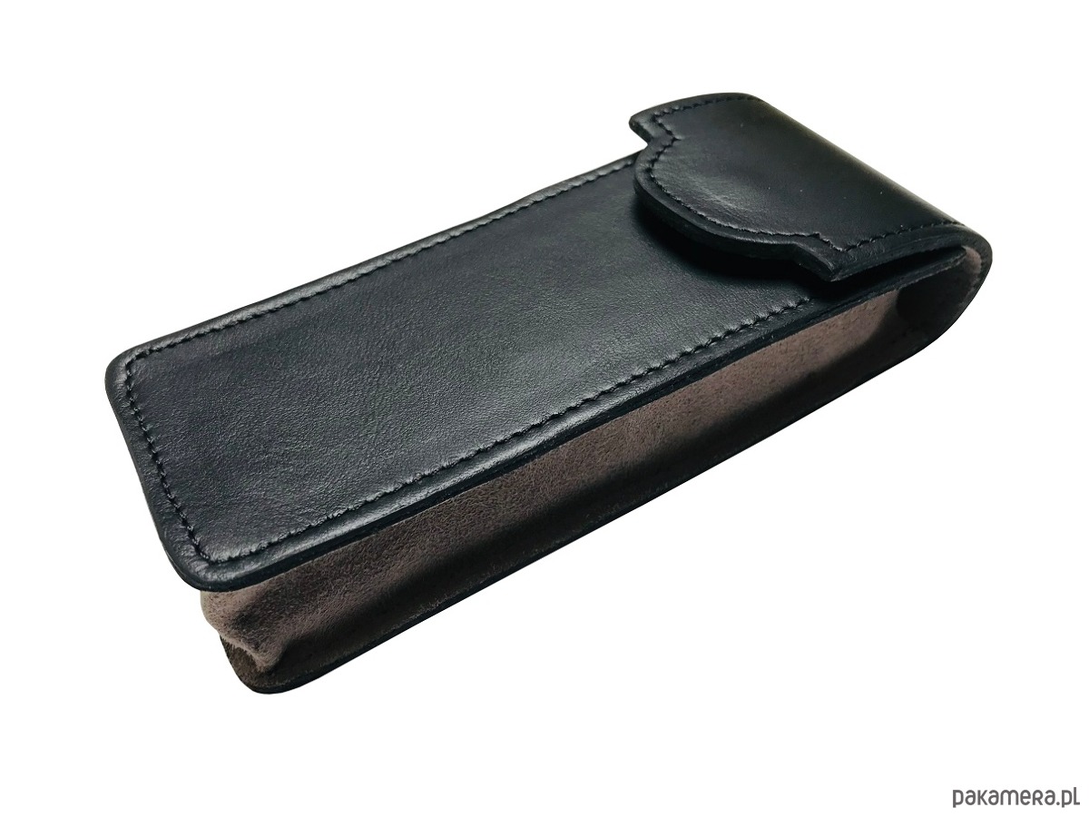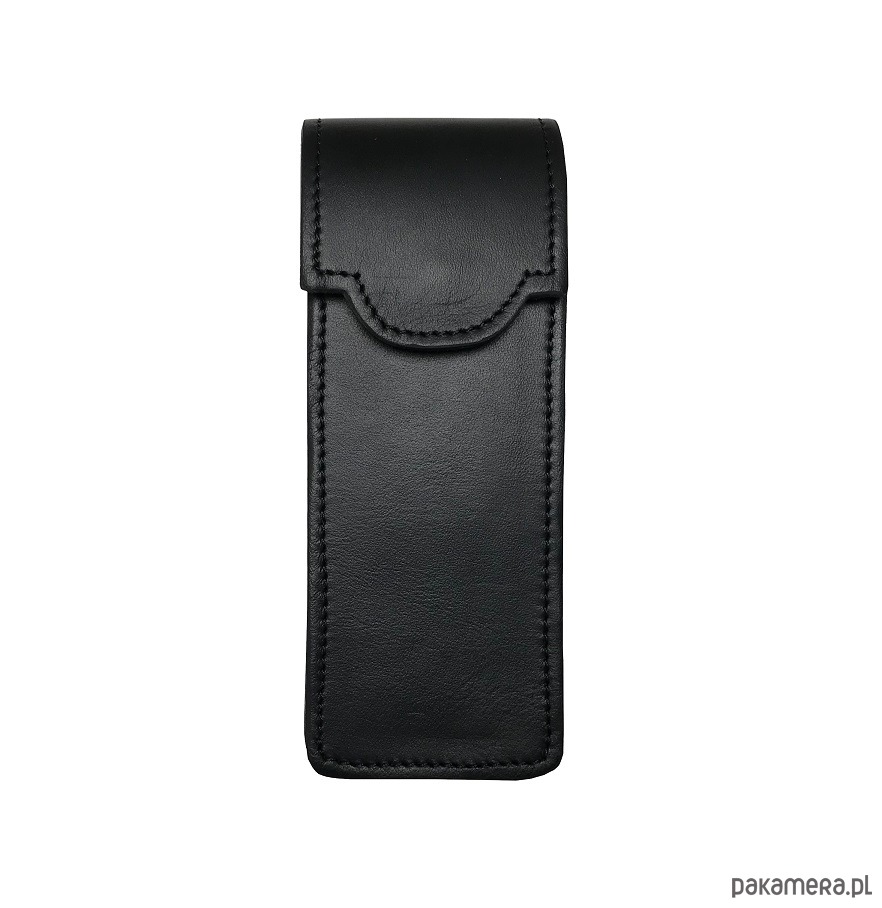 Etui wykonane z wysokiej jakości naturalnej skóry w kolorze czarnym z matowym wykończeniem w połączeniu ze skórą zamszową w kolorze popielatym . Skóra najwyższej jakości . Piękne etui w bardzo eleganckim i oryginalnym kształcie . Etui składa się z dwóch osobnych części , posiada wyciągany wkład z przegródkami co bardzo ułatwia wkładanie piór . Etui robione ręcznie przy użyciu tradycyjnych metod kaletniczych, zgodnych ze starą sztuką rzemieślniczą. Wymiary 6cmx16cmx3cm