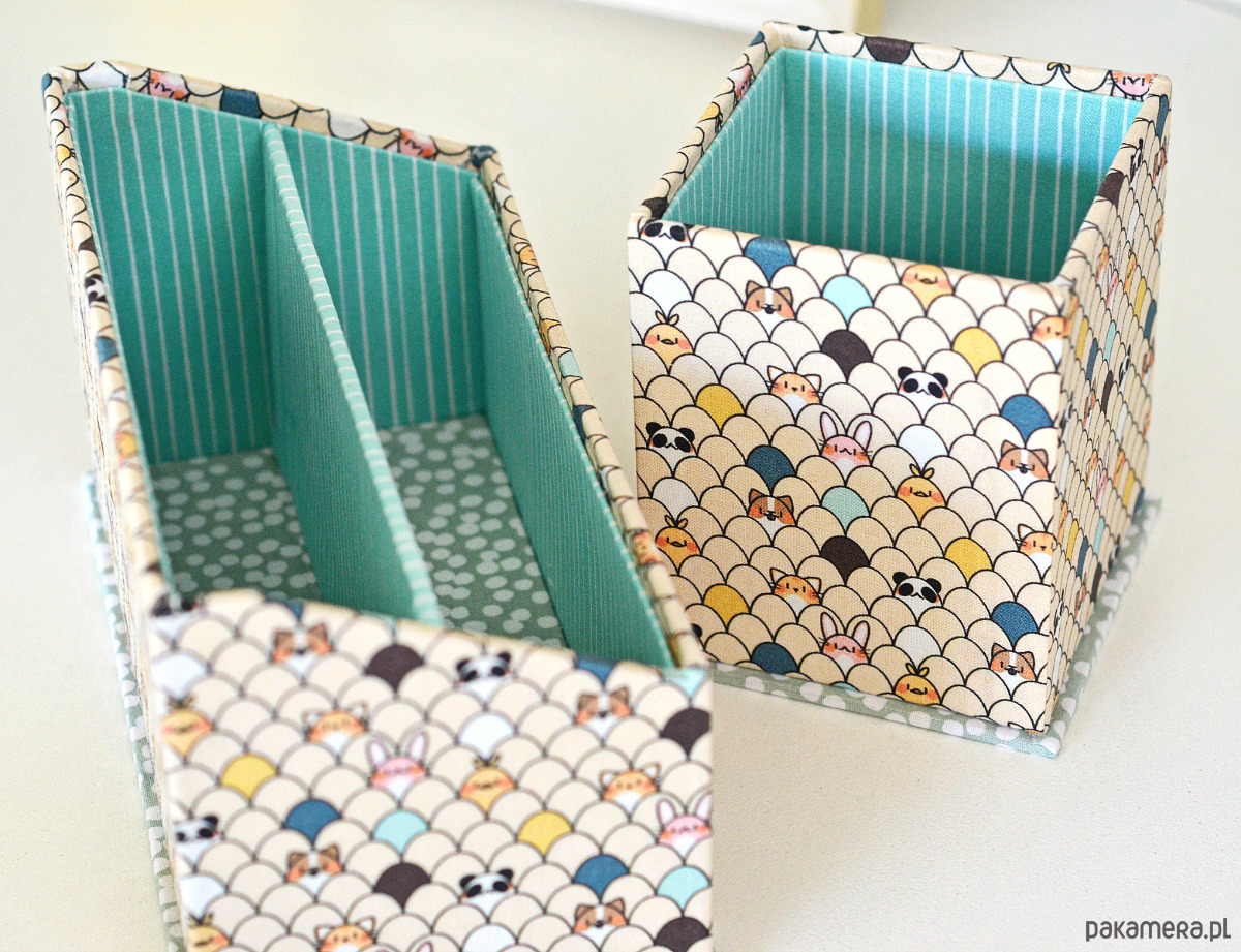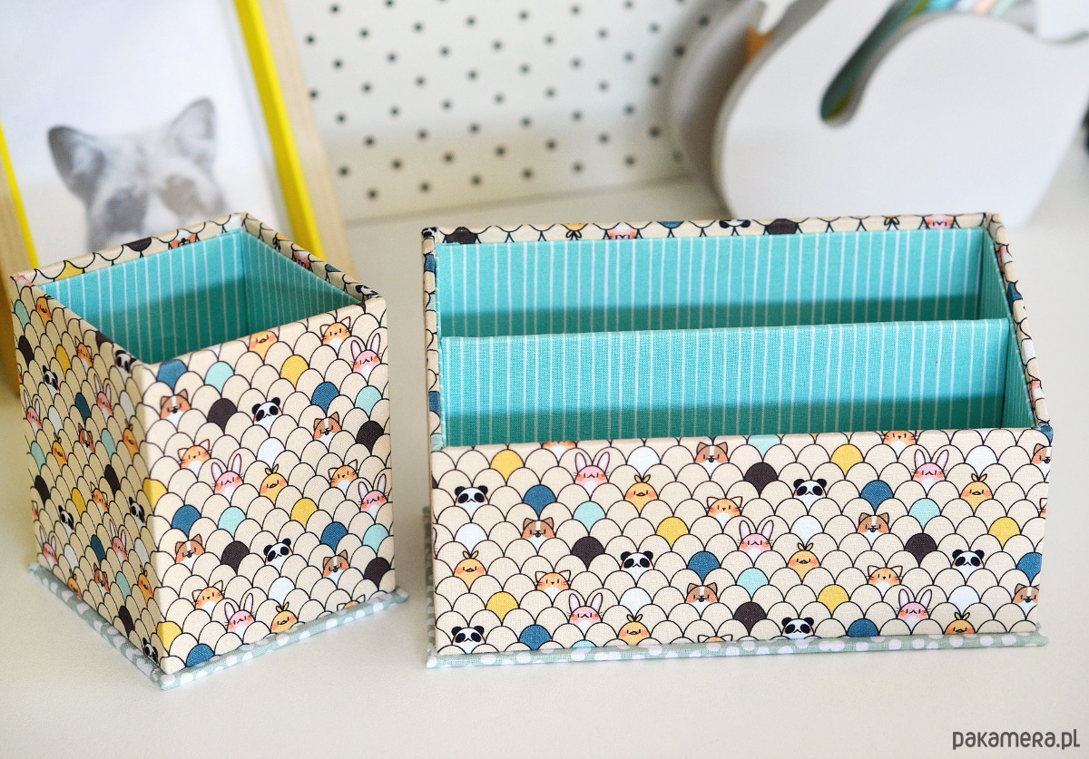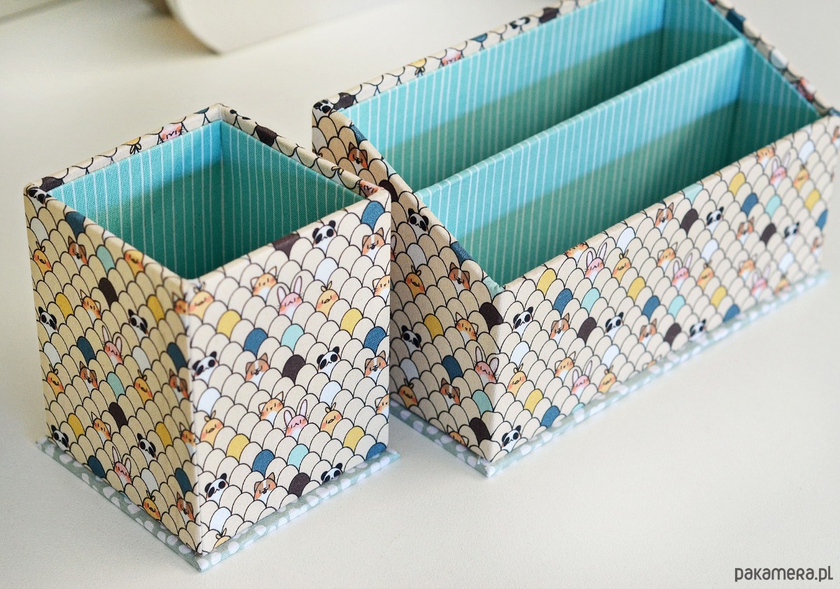 Zestaw organizerów na biurko, wykonanych metodą introligatorską z użyciem profesjonalnej tektury o dużej gęstości. Wykonane w 100% ręcznie, w całości oklejone przyjemnie miękką tkaniną bawełnianą w trzech uzupełniających się deseniach.