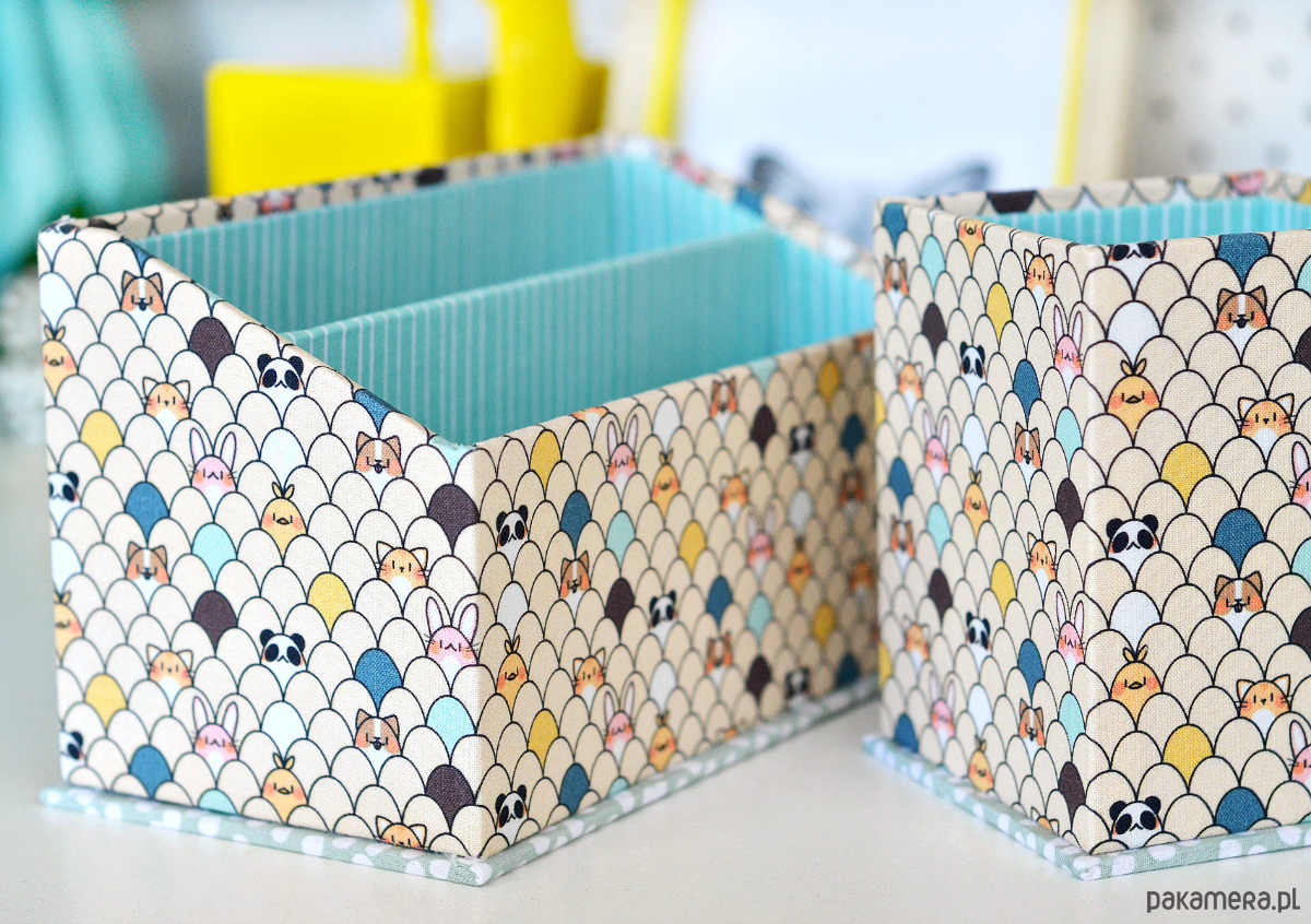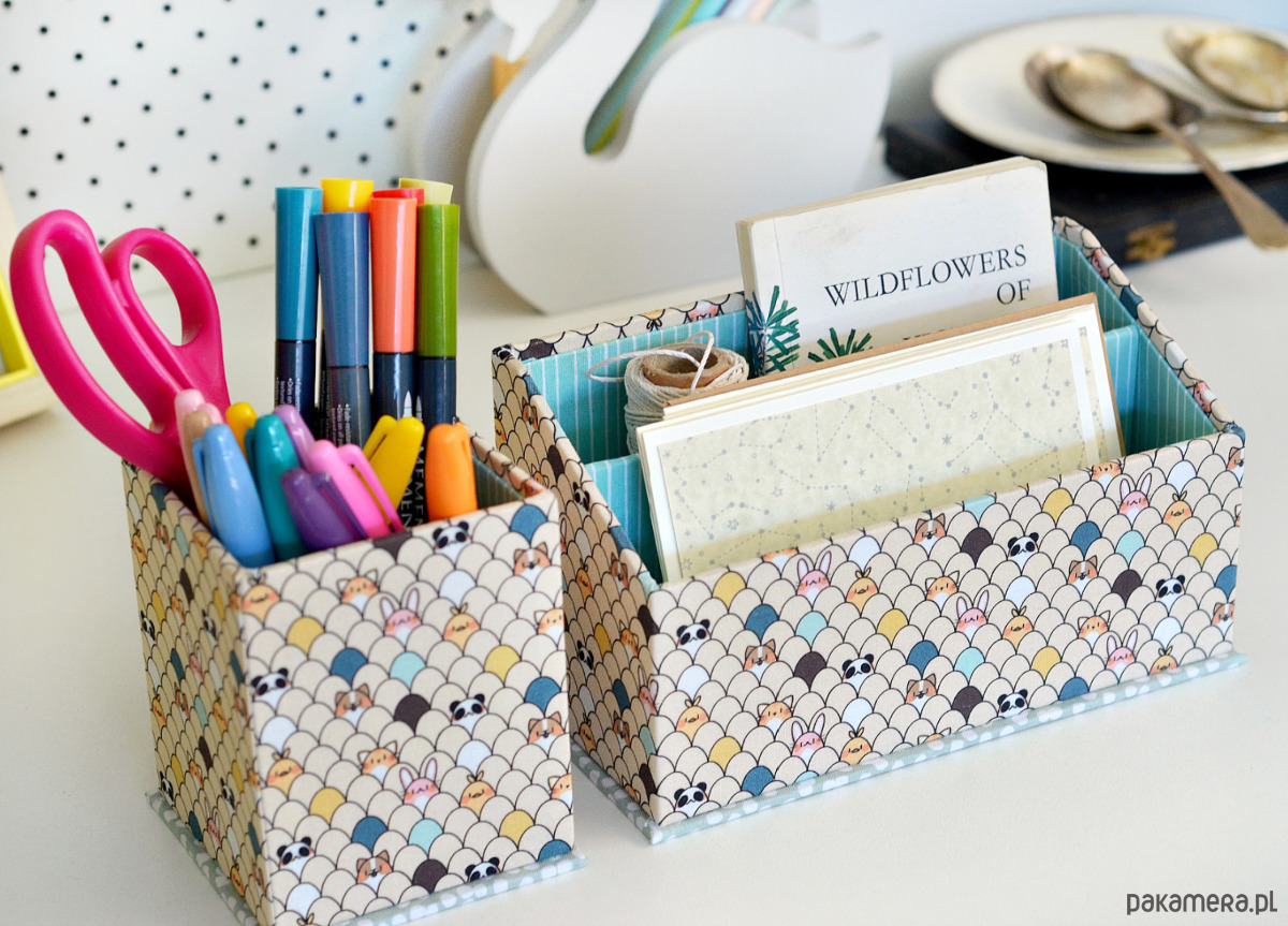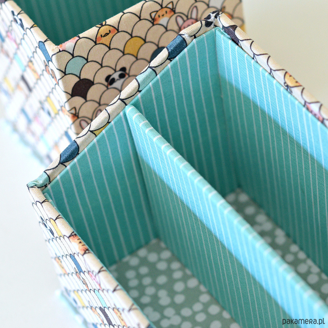 Zestaw organizerów na biurko, wykonanych metodą introligatorską z użyciem profesjonalnej tektury o dużej gęstości. Wykonane w 100% ręcznie, w całości oklejone przyjemnie miękką tkaniną bawełnianą w trzech uzupełniających się deseniach.