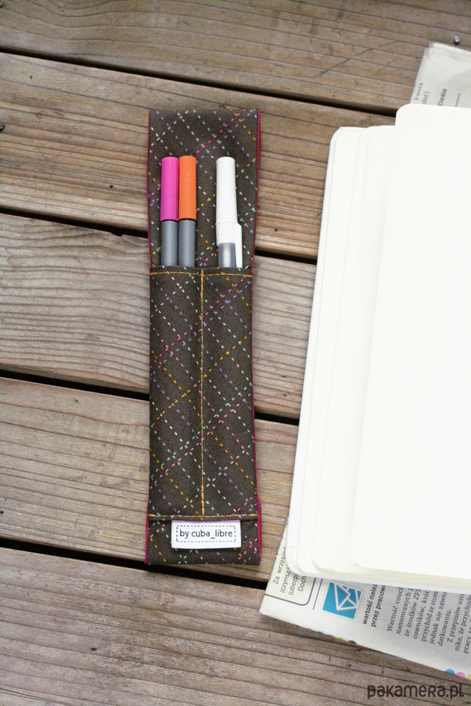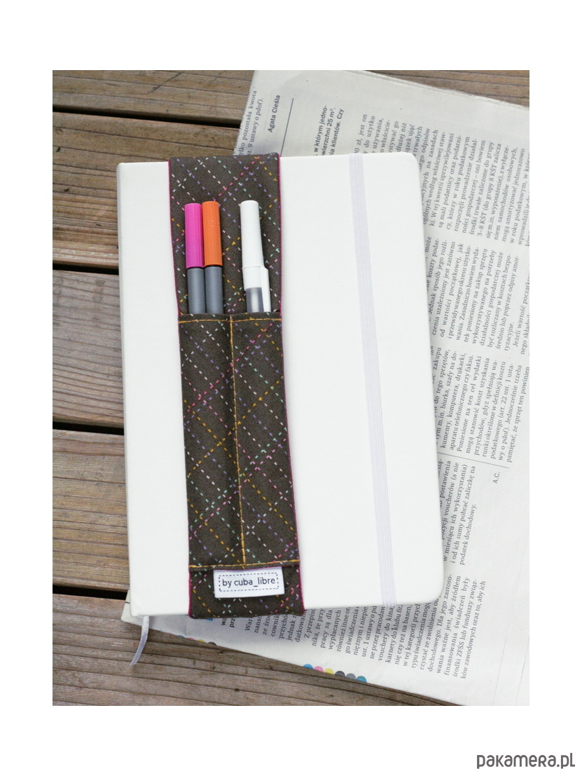Przybornik nakładany na notes czy kalendarz z dwoma kieszonkami na przybory do pisania. Zamiast nieść w ręku czy szukać w torebce długopisu będziemy mieć go zawsze pod ręką. Podczas pisania przybornik będzie leżał obok nas i służył jako piórnik.