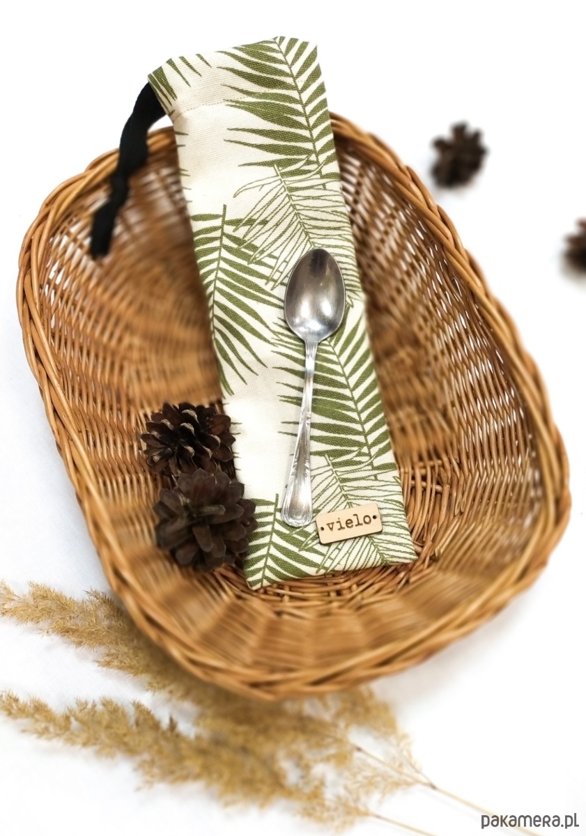Etui ma rozmiar około 8,5x26 cm. Zmieści się do niego łyżeczka, łyżka, nóż, słomka do napojów. Na dodatek etui jest w całości bawełniane! Na górze etui jest sznurek do jego ściągnięcia.