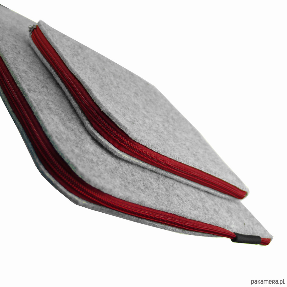 Użyte materiały: jasnoszary filc syntetyczny grubości 3-4 mm, odpowiednio wytrzymały, by chronić Twój laptop a z zewnątrz miękki i miły w dotyku. Bordowy zamek - mocny, plastikowy - dlatego nie uszkodzi i nie zarysuje obudowy laptopa podczas codziennego użytkowania. Czarna skóra użyta do wykończenia zamka.
