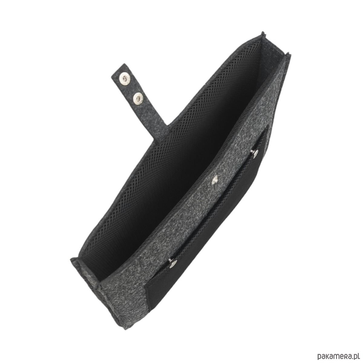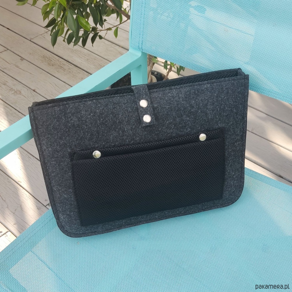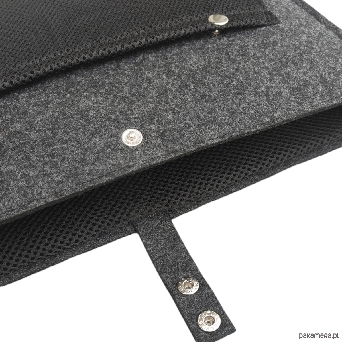 Twój laptop potrzebuje wyjątkowego pokrowca, aby zachować doskonały stan techniczny. Do jego wykonania użyliśmy wysokiej jakości filcu poliestrowego, który dodatkowo powleczony został z zewnątrz impregnatem, co zapobiegać ma mechaceniu się. W środku bez problemu zmieści się laptop o wymiarach 295mm/205mm/ 21mm ( można zamówić inne wymiary pokrowca). Wnętrze zabezpieczone czarną siatką dystansową. Etui zamykane filcowym paskiem z napami. Na przodzie naszyliśmy kieszeń z czarnej siatki dystansowej zapinanej na dwa napy. Organizer nadaje się do samodzielnego przenoszenia laptopa jak i wewnątrz większej torby. Laptop będzie na pewno dobrze odizolowany od ewentualnych uderzeń i zadrapań.