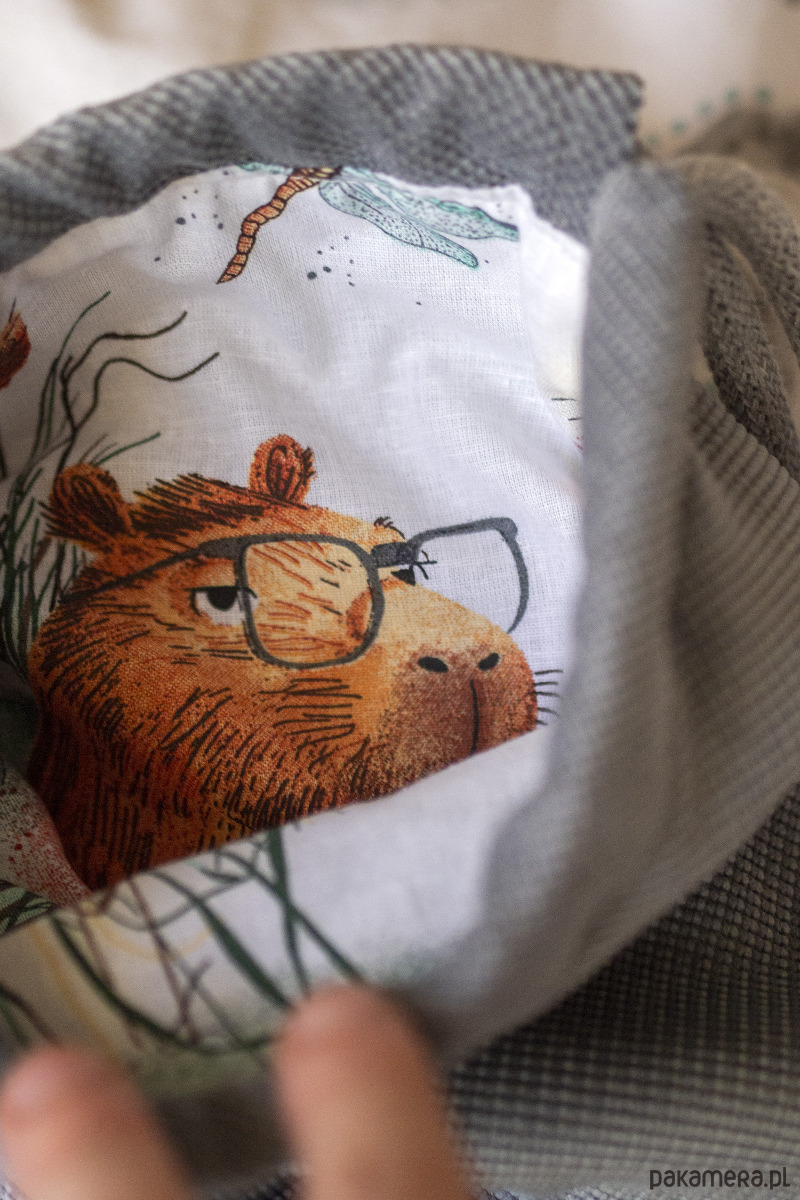 Biała, bawełniana podszewka w kapibary, okrągłe dno. Całości dopełnia gruby, bawełniany sznurek w kolorze jasnoszarym.