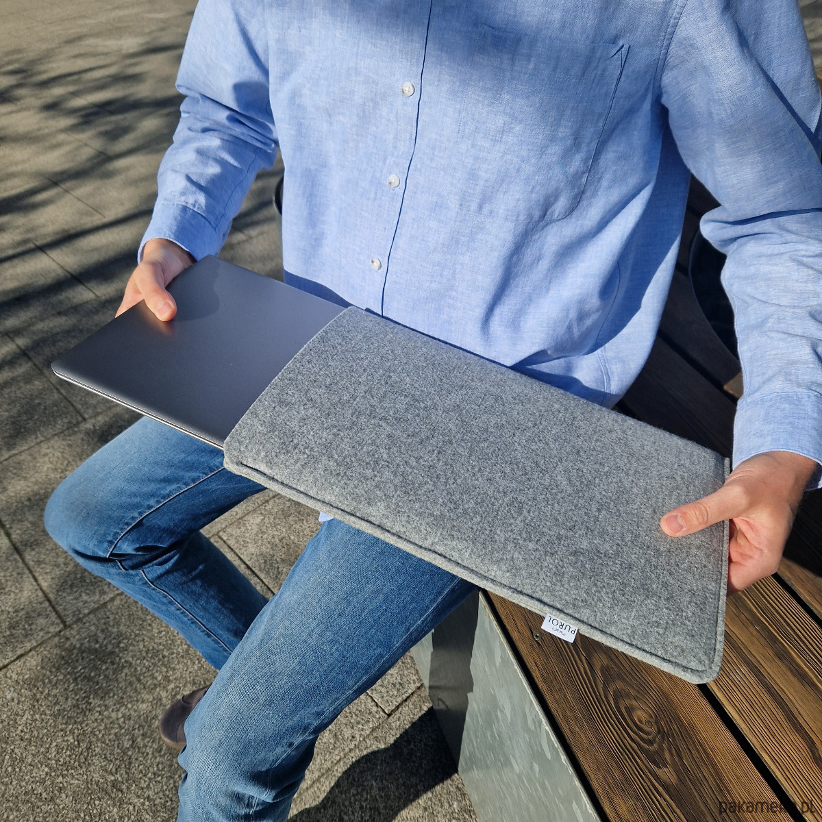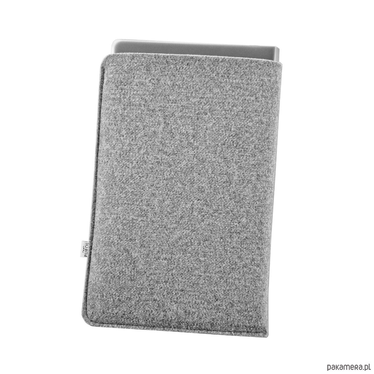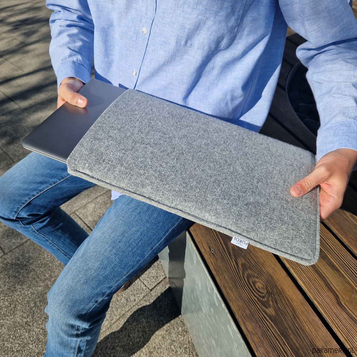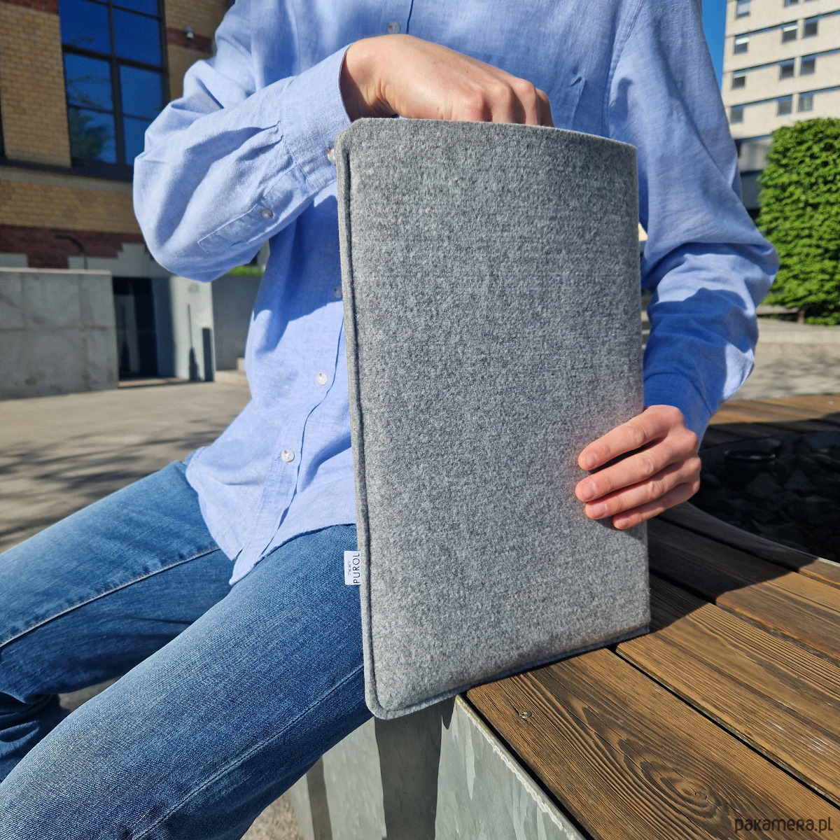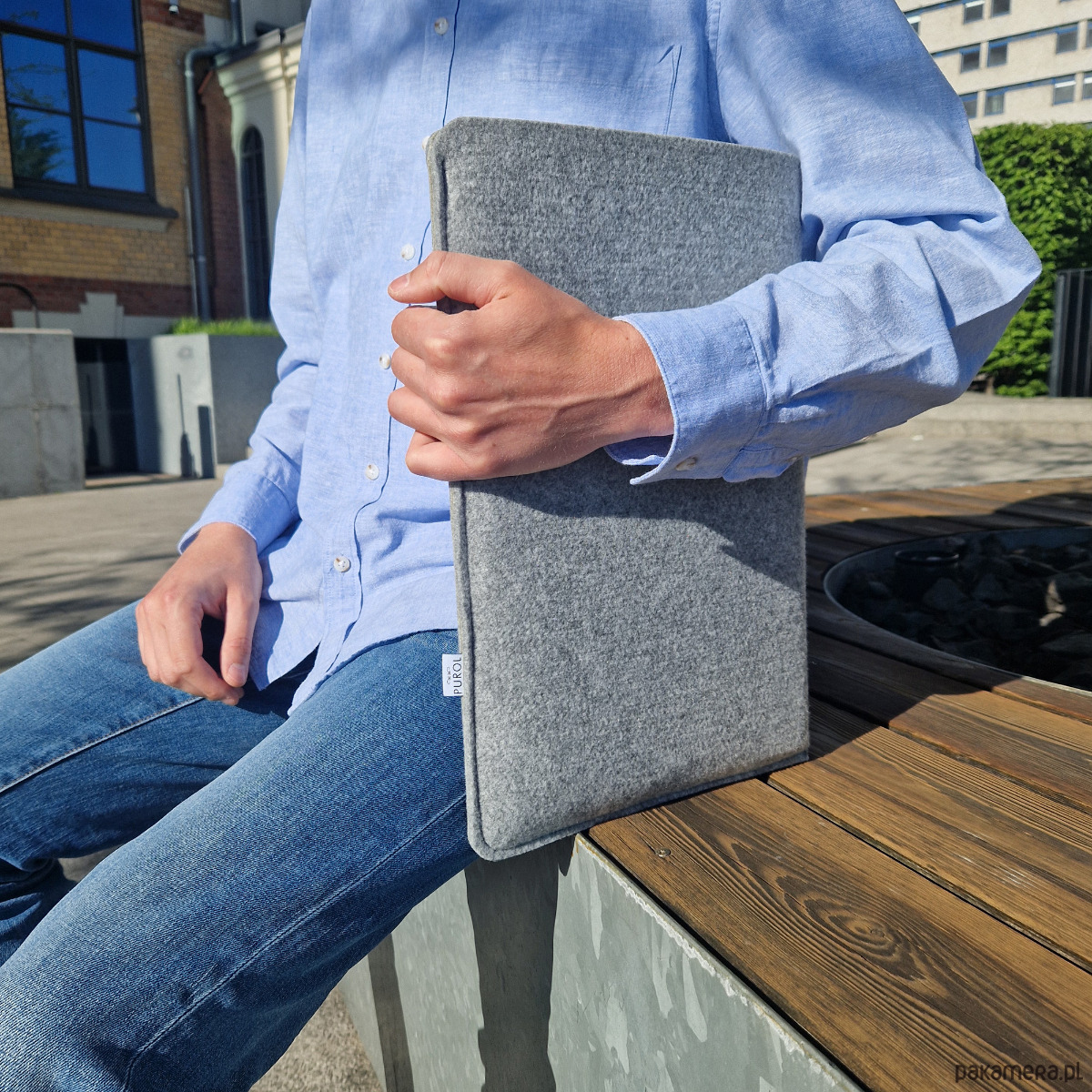Pionowy pokrowiec z jasnoszarego filcu na laptopa.