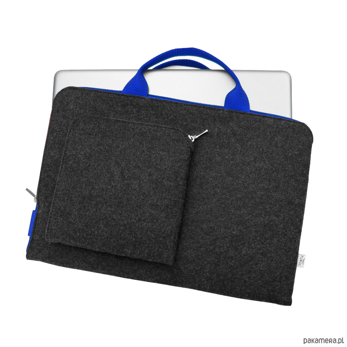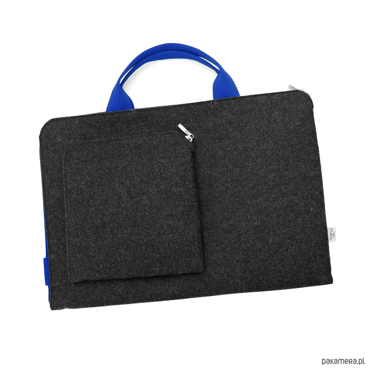 Pokrowiec z filcu na laptopa z rączką i naszytą dodatkową kieszonką na zasilacz.