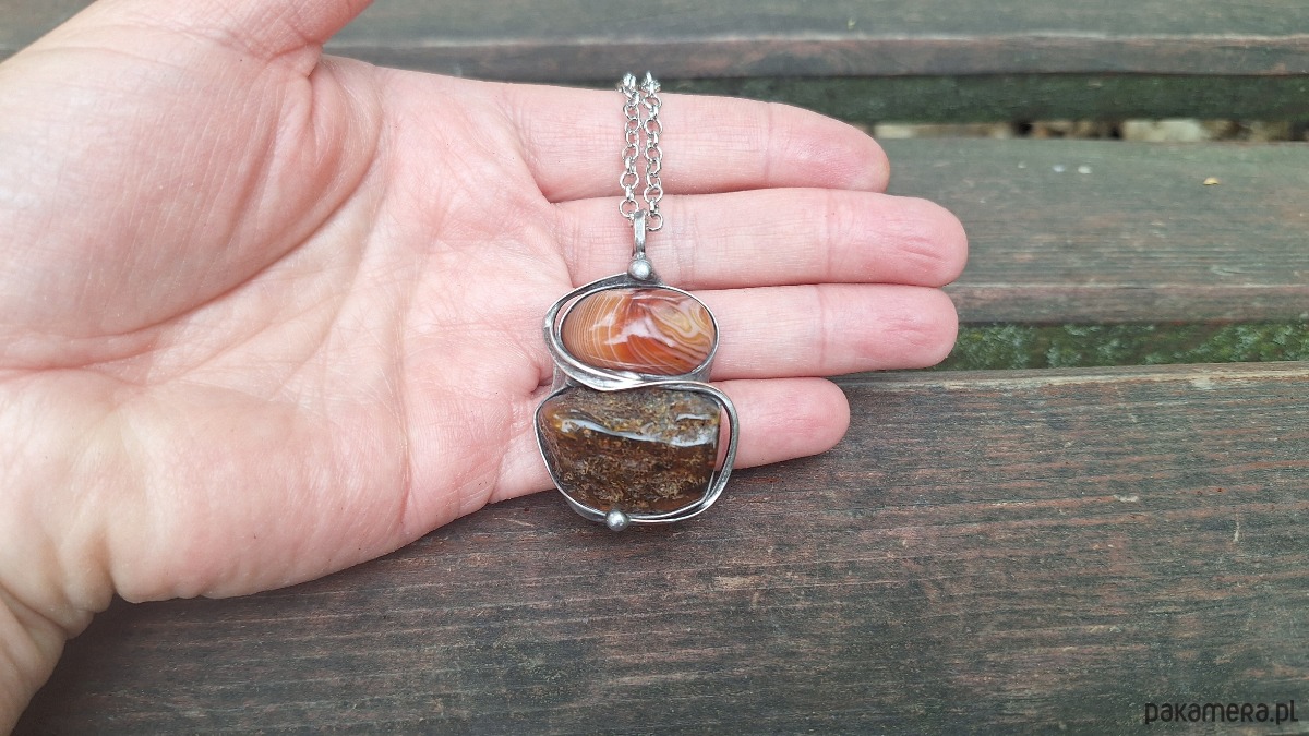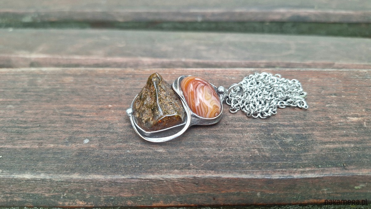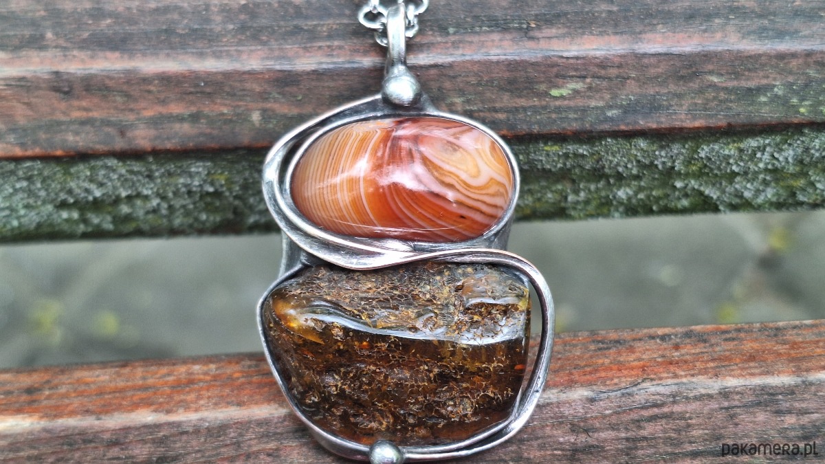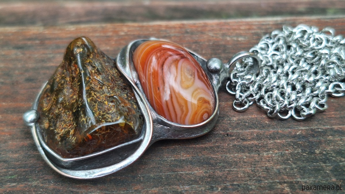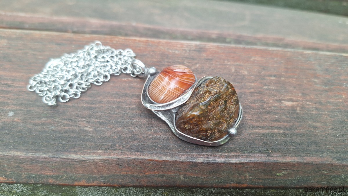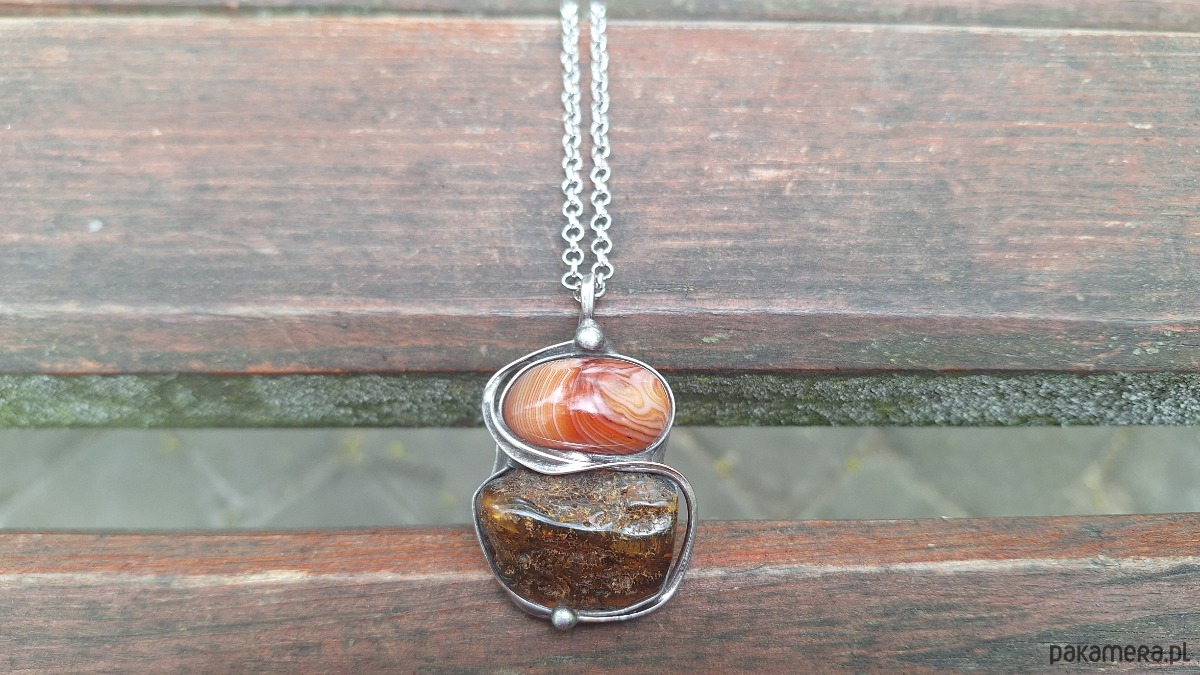 Wisiorek wykonany z miedzi, cyny, agatu i bursztynu. Wymiary ok. 4 na 3 cm. Zawieszony na łańcuszku o długości ok. 50 cm.