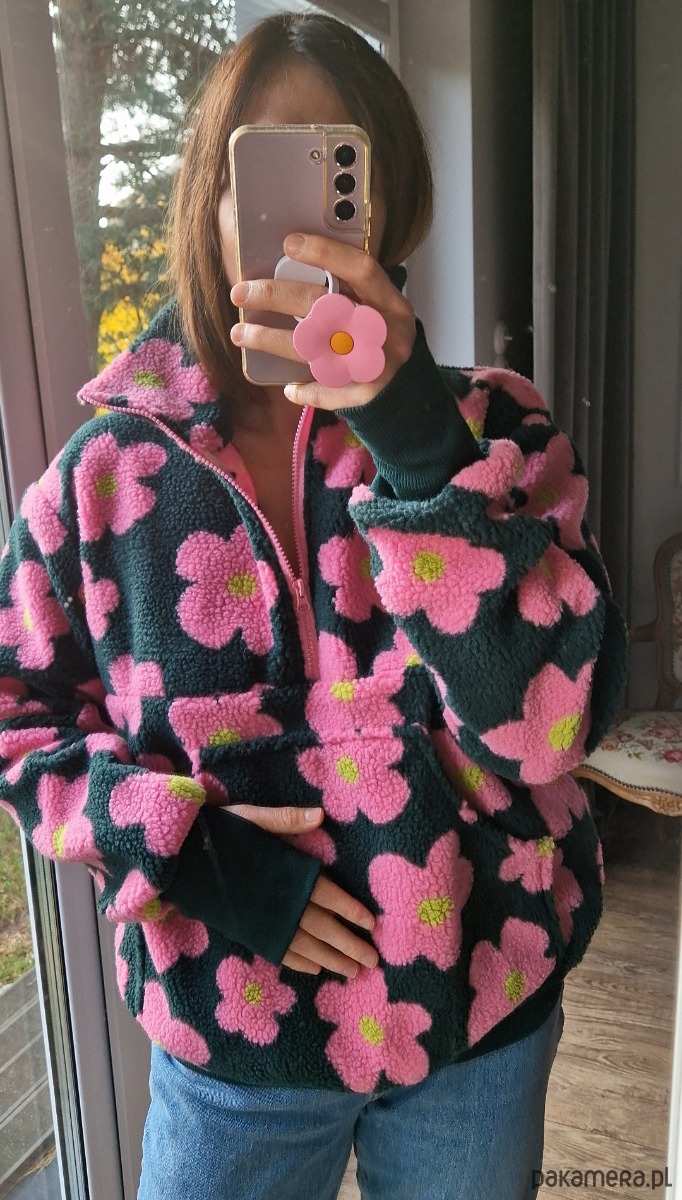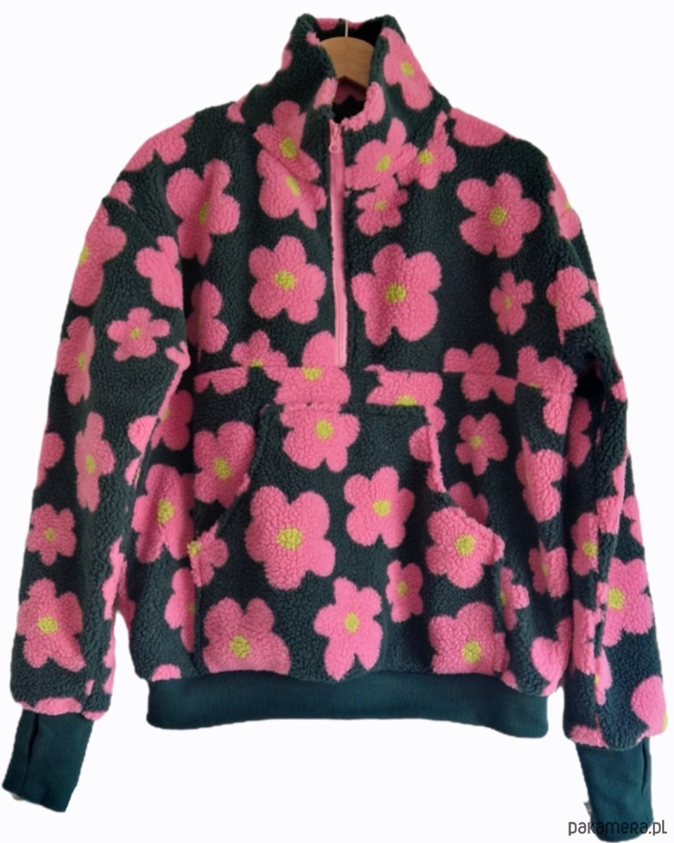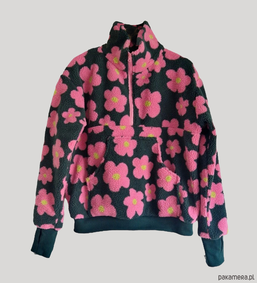 Bluza z polaru w uroczy wzór różowych kwiatków na ciemno zielonym tle